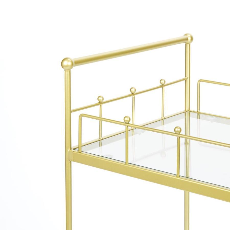 Contemporary style 2 Glass tiers with open design Locking caster wheels Comes in 3 metal finishes: gold, antique gold, hammer rectangular