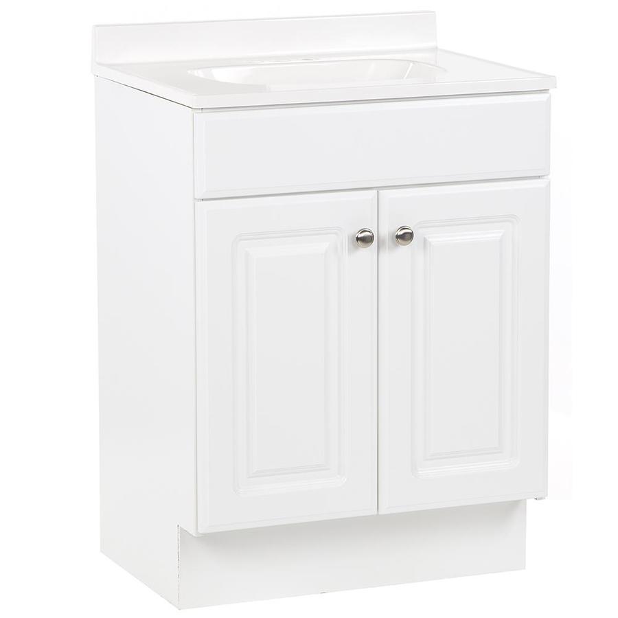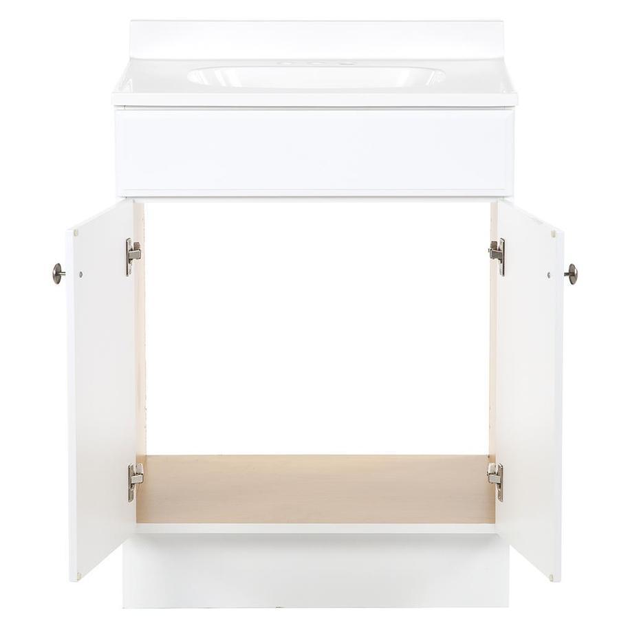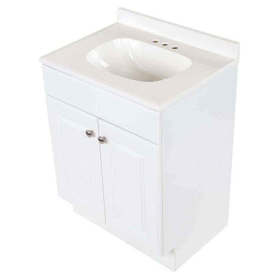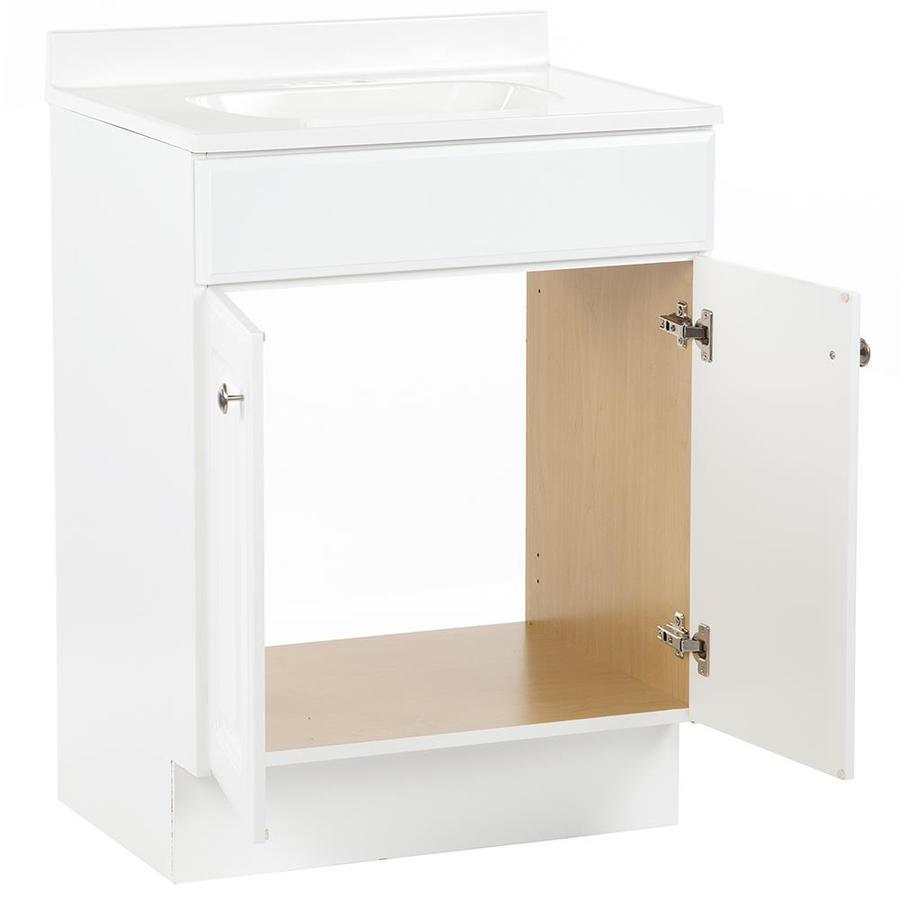 White finish vanity complements a variety of color palettes Cultured marble top with integrated bowl for a seamless, one-piece design 24.5-in W x 18.6-in D bathroom vanity with top Great for traditional style decor Pre-drilled for a 4-in centerset faucet for easy installation (faucet sold separately) Brushed nickel finish hardware adds a shiny touch Two raised-panel cabinet doors with 6-way adjustable hinges provide access to interior storage Fully assembled and ready to be installed Coordinating mirror available (sold separately)