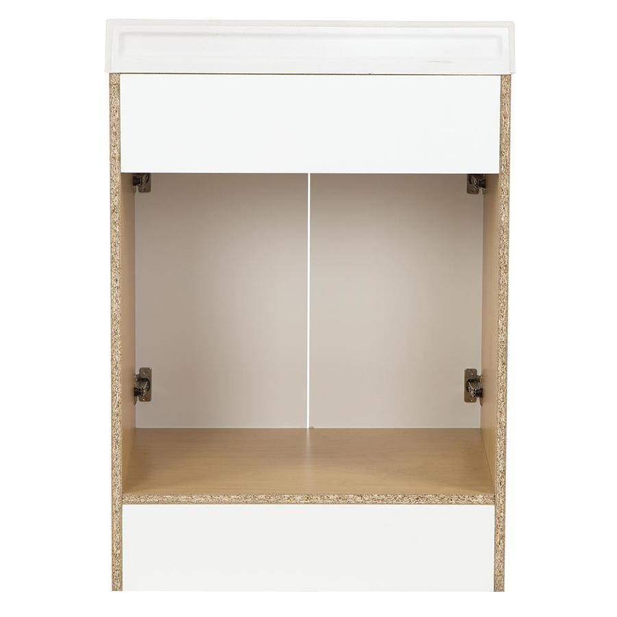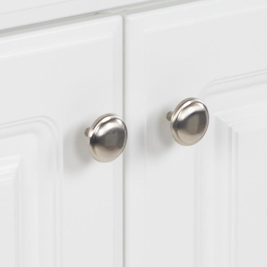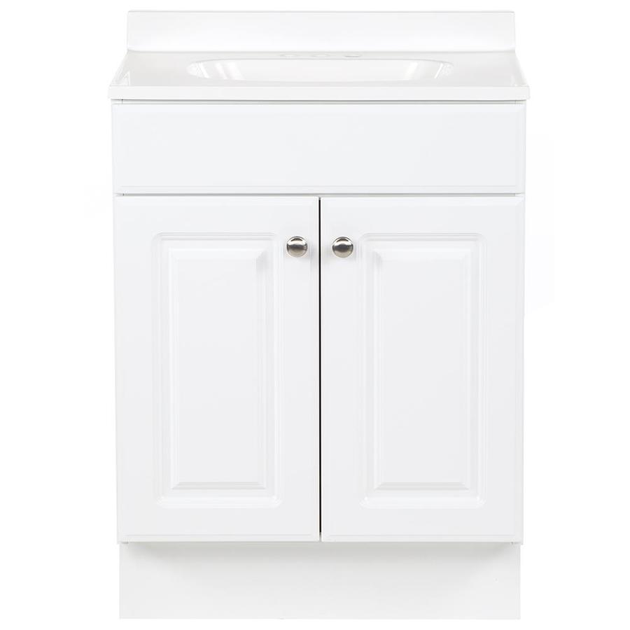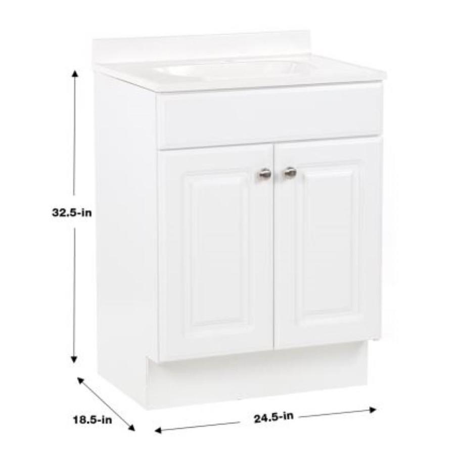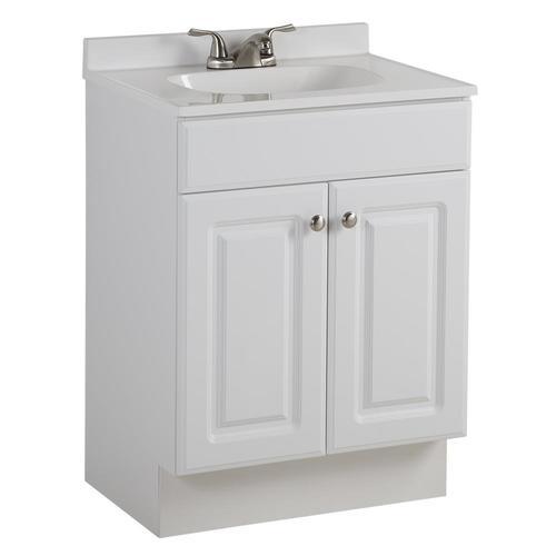 White finish vanity complements a variety of color palettes Cultured marble top with integrated bowl for a seamless, one-piece design 24.5-in W x 18.6-in D bathroom vanity with top Great for traditional style decor Pre-drilled for a 4-in centerset faucet for easy installation (faucet sold separately) Brushed nickel finish hardware adds a shiny touch Two raised-panel cabinet doors with 6-way adjustable hinges provide access to interior storage Fully assembled and ready to be installed Coordinating mirror available (sold separately)