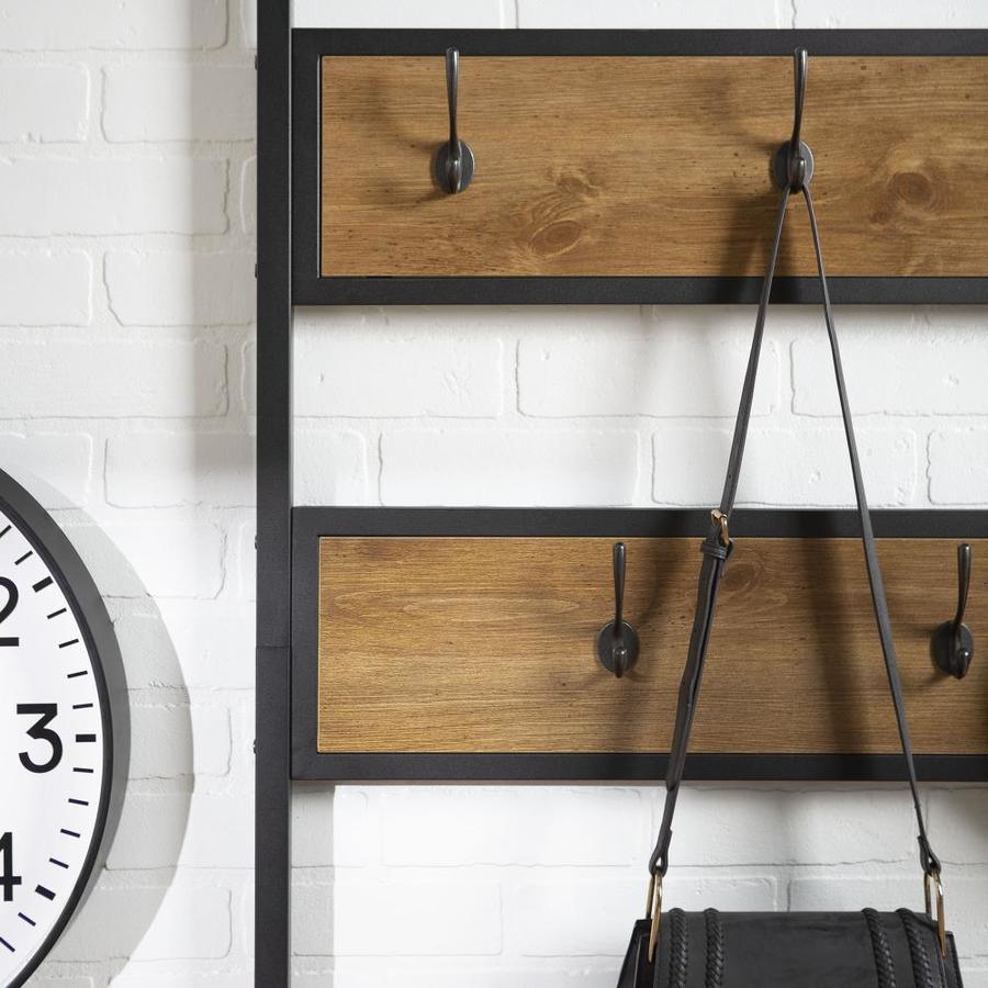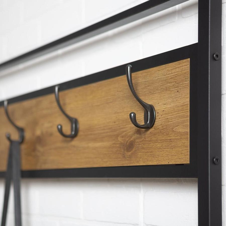 Designed to add an industrial style in your entryway, mudroom, or hallway Made of high-grade MDF and with a powder-coated metal frame With seven hangers to hang clothing and bags With an open bottom shelf for storage and perfect for shoes Bench included to sit on or keep your bags Ships ready-to-assemble with step-by-step instructions
