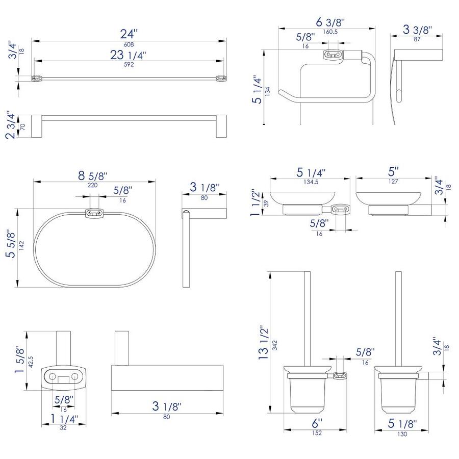 Package Contents 6 Piece Set Includes: Towel Bar, Towel Ring, Robe Hook, Soap Dish, Toilet Brush Holder and Toilet Paper Holder