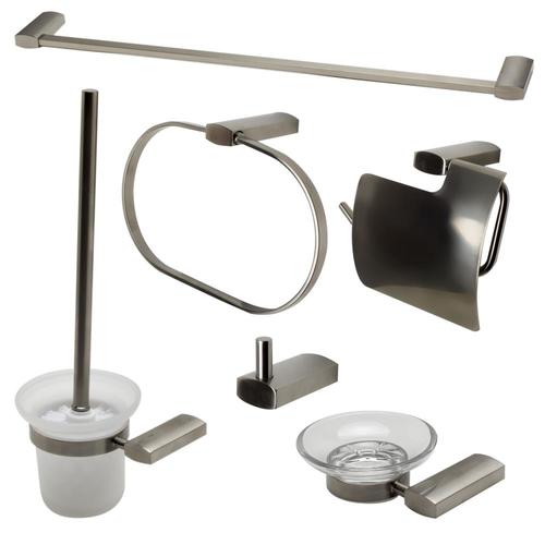 6 Piece Set Includes: Towel Bar, Towel Ring, Robe Hook, Soap Dish, Toilet Brush Holder and Toilet Paper Holder Coated with a Brushed Nickel finish Expertly crafted solid brass construction for long-lasting durability Sleek design matches most dcor styles Save money by purchasing a whole set instead of individual items Premium grade materials that feel and look luxurious