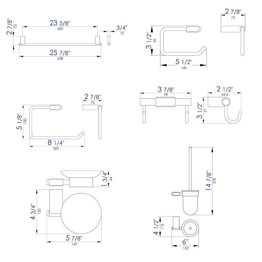 Package Contents 6 Piece Set Includes: Towel Bar, Towel Ring, Robe Hook, Soap Dish, Toilet Brush Holder and Toilet Paper Holder
