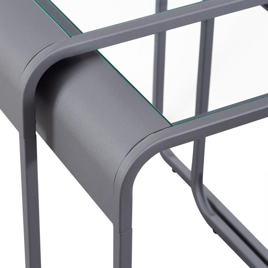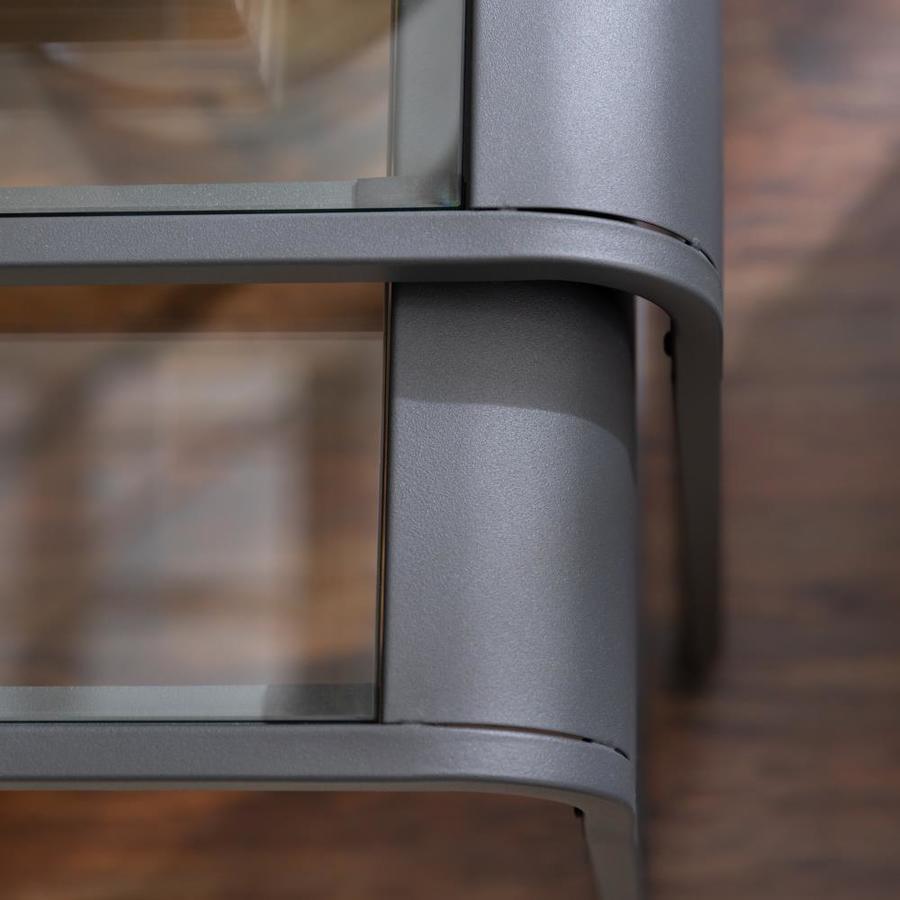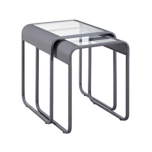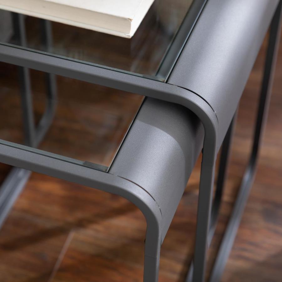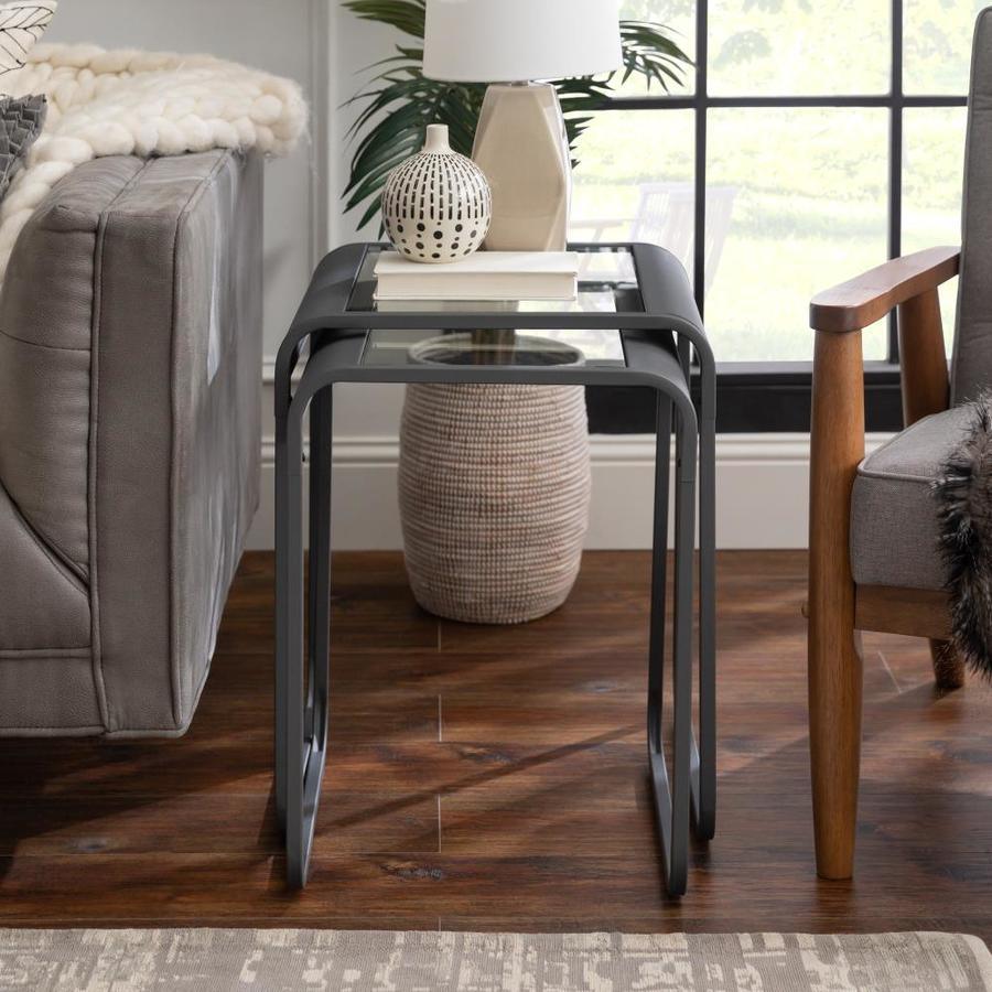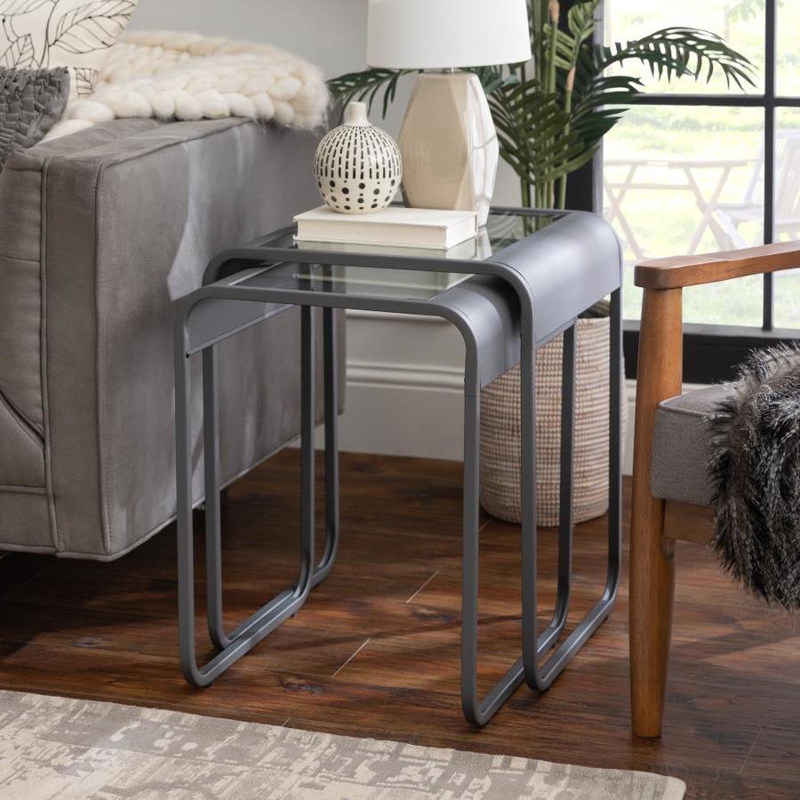 Industrial design with a modern finish Made of metal and glass Including two side tables to use together or apart Ideal in your living room beside your couch or as a nightstand in your bedroom Curved edges for a sleek appearance Ships ready-to-assemble with step-by-step instructions