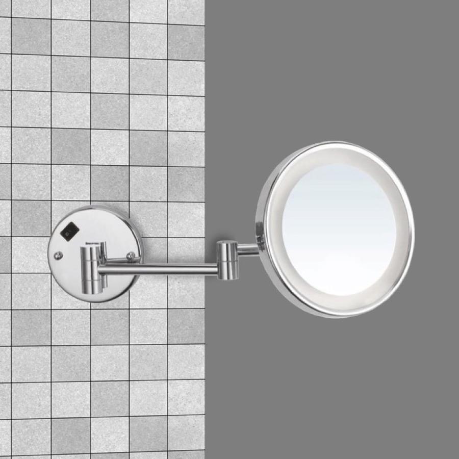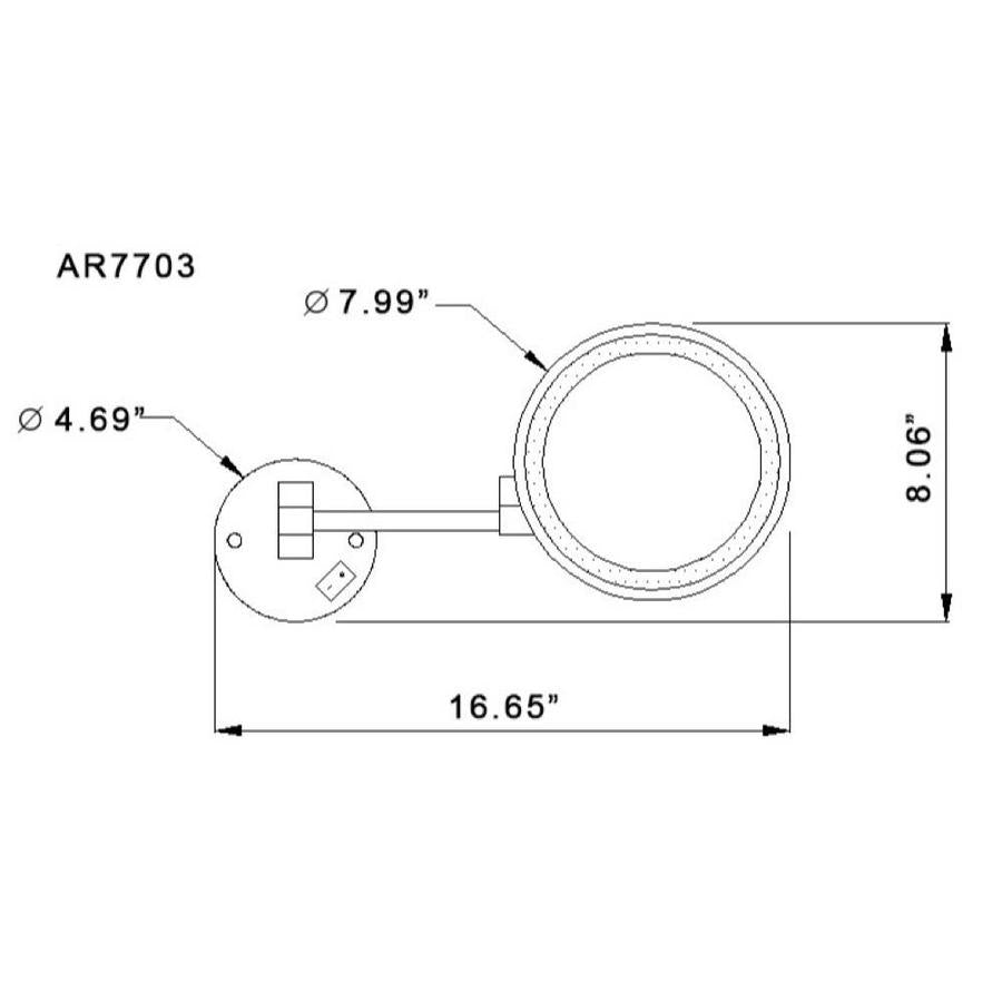8 in round wall mounted mirror Single face makeup mirror 5x magnification Makeup mirror is hardwired Made of brass Contemporary style makeup mirror Hardwire installation On/off switch on base LED light