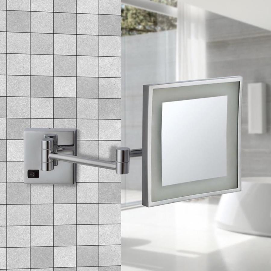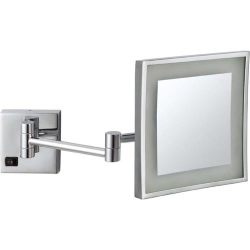 8 in square wall mounted mirror Hardwire installation Single face makeup mirror 5x magnification LED light Made of brass On/off switch on base Contemporary style makeup mirror Base made from stainless steel