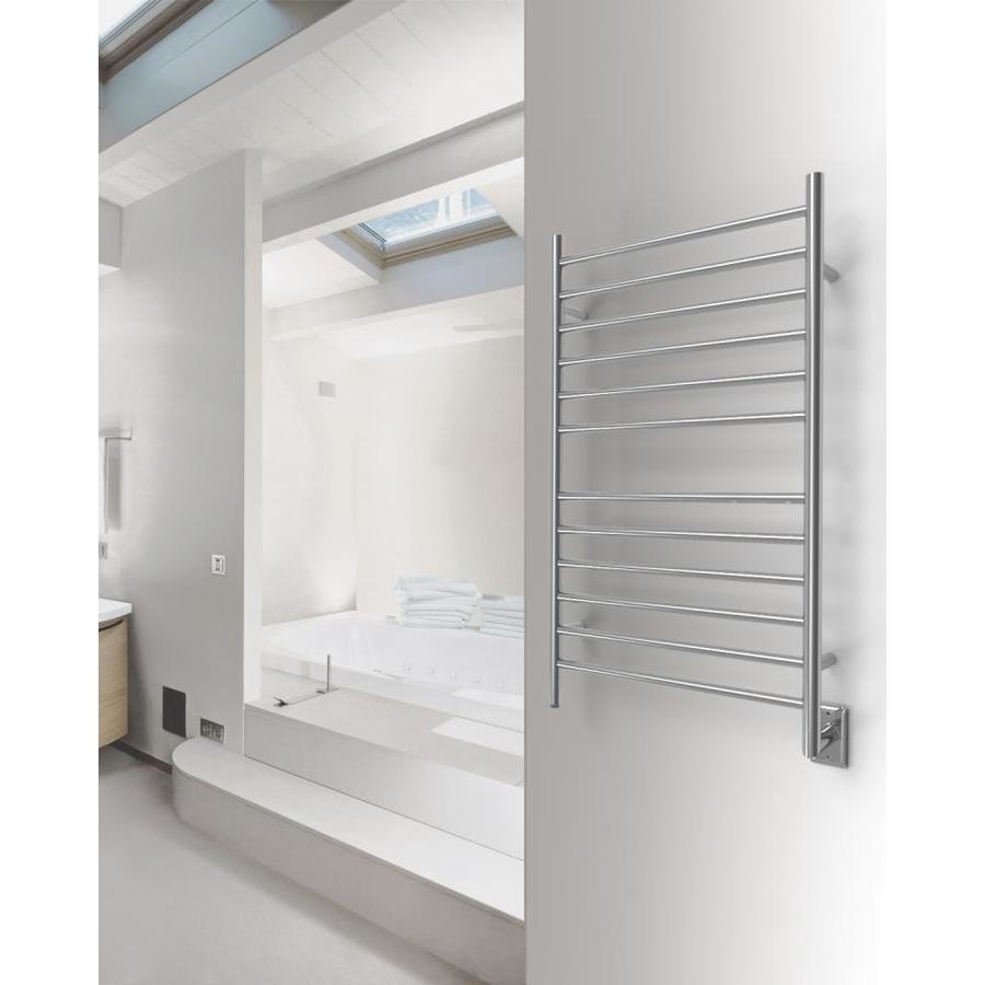 Dry and warm towels and bathrobes; reduce laundry frequency Use in laundry rooms, mud rooms and wet rooms to dry delicates, rain or ski jackets and bathing suits 12 Horizontal bars - all vertical and horizontal bars heat up Offered in 2 different finishes: brushed and polished stainless steel Ideal for drying and warming 2 large towels Hardwired towel warmer with integrated on/off switch Unit takes 10-15min to heat up; additional time required to warm/dry towel 150 Watts; 1.3 Amps; 120 Volts 2 Year warranty