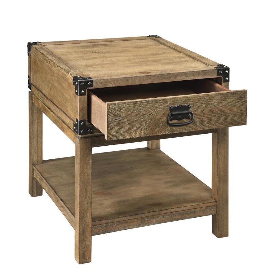 Pine, pine veneer, and MDF Natural brown finish Black metal accents 1 Drawer