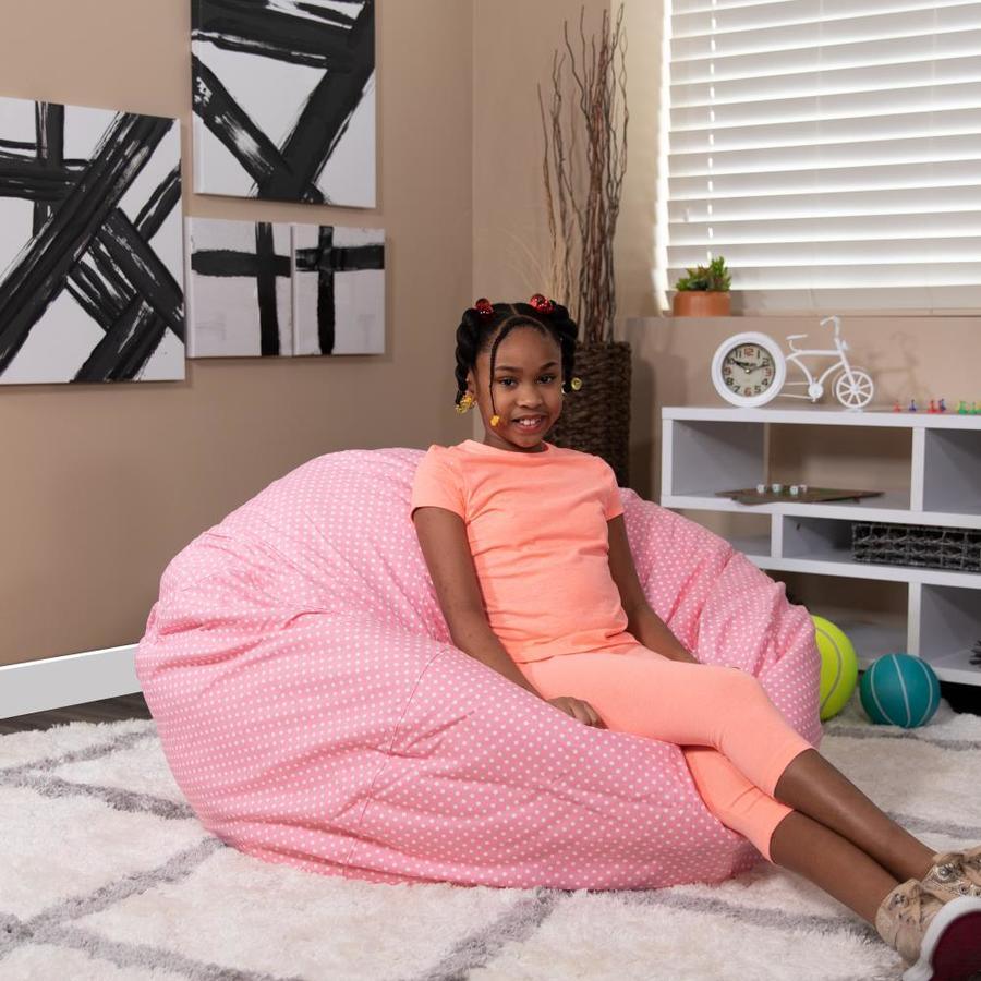 Oversized Bean Bag Portable Lightweight Design Light Pink Cover with Mini White Dots Cotton-Twill Upholstery Spot Clean with damp cloth Machine Washable Removable Slip Cover Wash using Cold Water; Do Not Bleach Safety Metal Zipper secures polystyrene polymeric beads