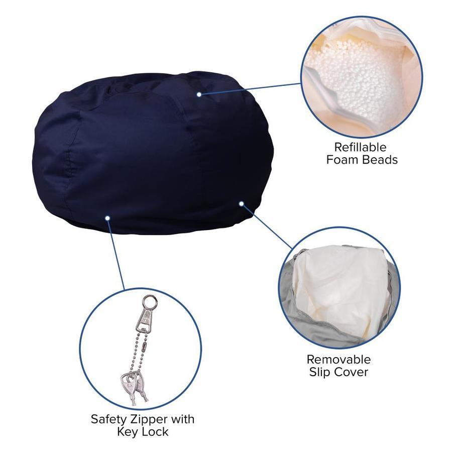 Oversized Bean Bag Portable Lightweight Design Solid Navy Blue Cover Cotton-Twill Upholstery Spot Clean with damp cloth Machine Washable Removable Slip Cover Wash using Cold Water; Do Not Bleach Safety Metal Zipper secures polystyrene polymeric beads