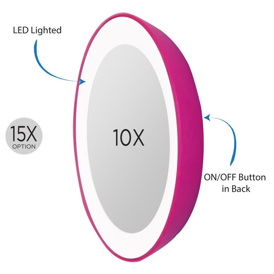 The ultra-bright LEDs emulate the effect of natural daylight while providing even light dispersion so you never miss a single detail Powerful 10X magnification is great for touch-ups, contact lens and makeup application, eyebrow grooming, and seeing every fine detail The powerful suction cups on the back of the mirror allows you to mount to almost any smooth, flat surface for hands-free makeup application and grooming use Created with your evening bag in mind, this lightweight spot mirror is the perfect on-the-go beauty and grooming companion for quick touch-ups anytime, anywhere Product dimensions: 4.5-in x 0.75-in x 4.5-in Made in the USA batteries included pink finish