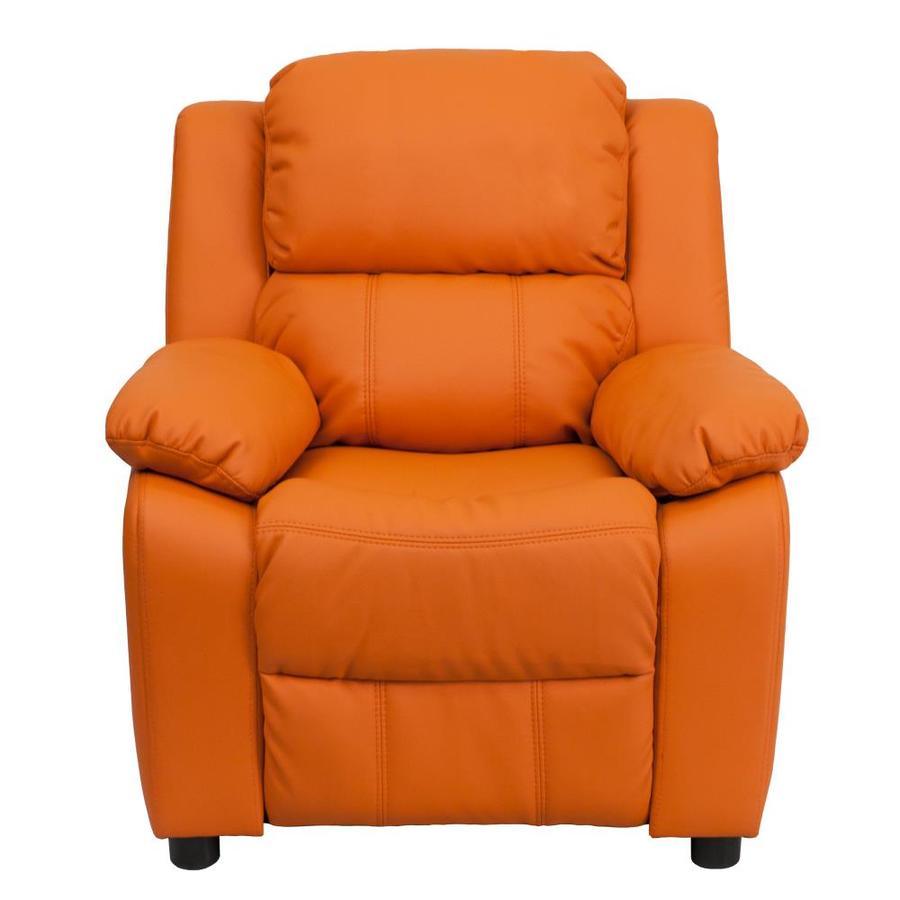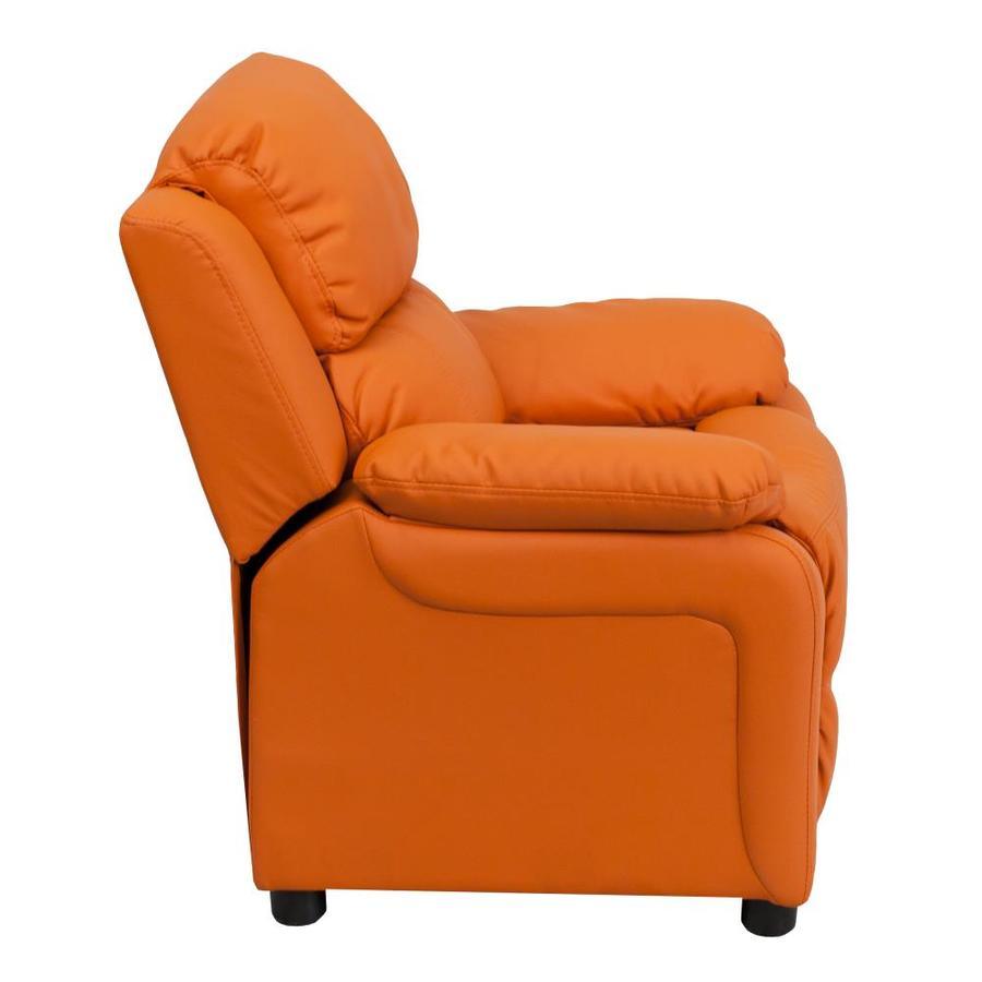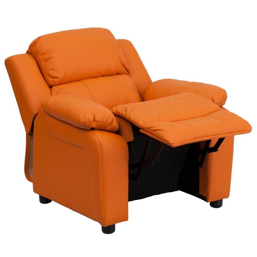 Kids Recliner Orange Vinyl Upholstery Plush Padded Back and Arms, Headrest Cover Flip-Up Storage Arms, Storage Arm Size: 3.25-inW x 6-inD x 11-inH, Raised Plastic Feet Safety Feature: will not recline unless child is in seated position and pulls ottoman 1-in out and then reclines Wall Clearance: 6-in Solid Hardwood Frame Construction 90 lb. Weight Capacity CAL 117 Fire Retardant Foam