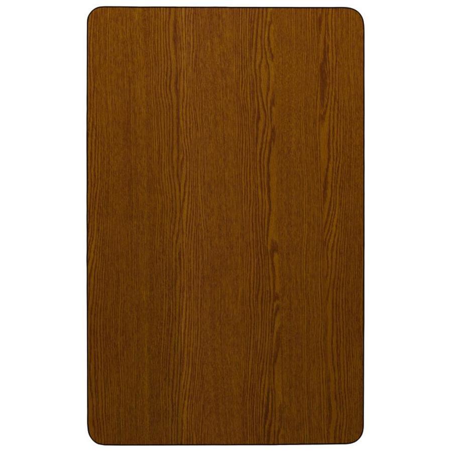 Popular Rectangular Activity Table Scratch and Stain Resistant Surface 1.25-in Thick High Pressure Oak Laminate Top Black Edge Band 16 Gauge Tubular Steel Legs Black Powder Coated Upper Legs and Chrome Lower Legs Legs Adjust in 1-in Increments Locking Casters Recommended Grade Level: 1st Grade - Adult