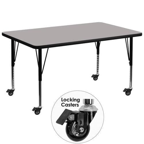 Popular Rectangular Activity Table Recommended Grade Level: Preschool - 2nd Grade Recommended Seating Capacity: 10 Children Scratch and Stain Resistant Surface 1.25-in Thick High Pressure Grey Laminate Top Black Edge Band 16 Gauge Tubular Steel Legs Black Powder Coated Upper Legs and Chrome Lower Legs Legs Adjust in 1-in Increments
