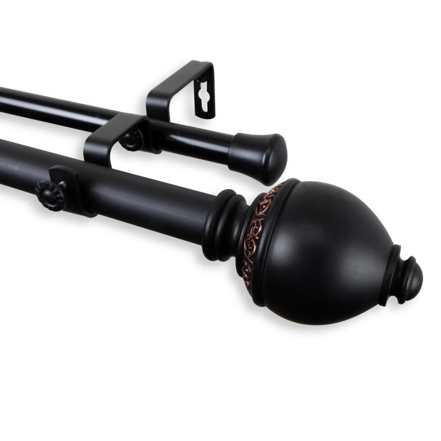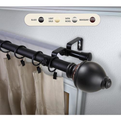 Includes two 1-in diameter adjustable poles, extends 160-240 inch, five double brackets, one pair of decorative finials, and mounting hardware Finial measurement: 3-5/8-in W x 2-3/8-in H x 2-3/8-in D Bracket projection: front rod to wall 6.75 inch; back rod to wall 3.75 inch Material: steel rod/resin finials