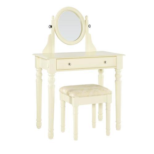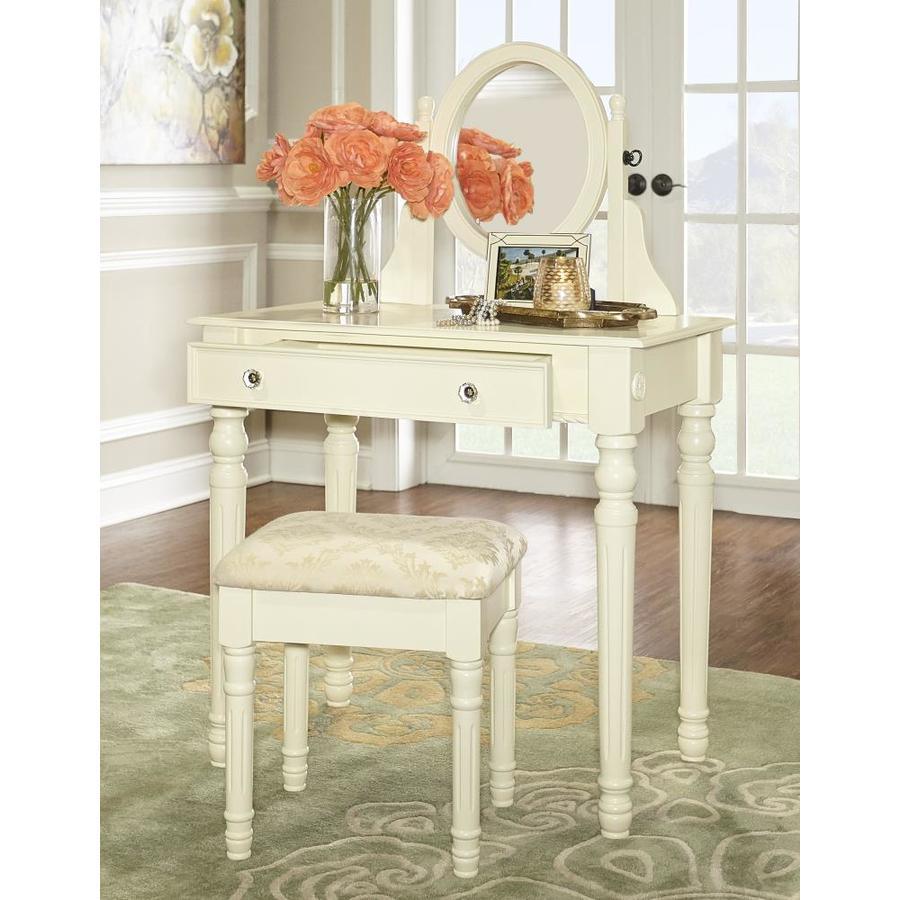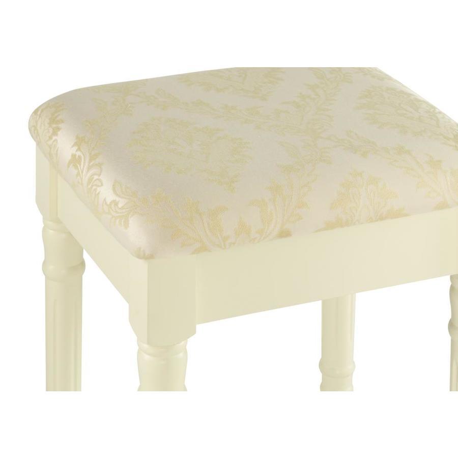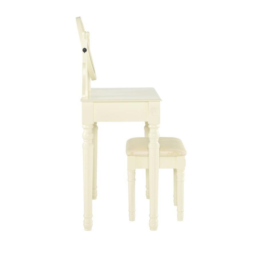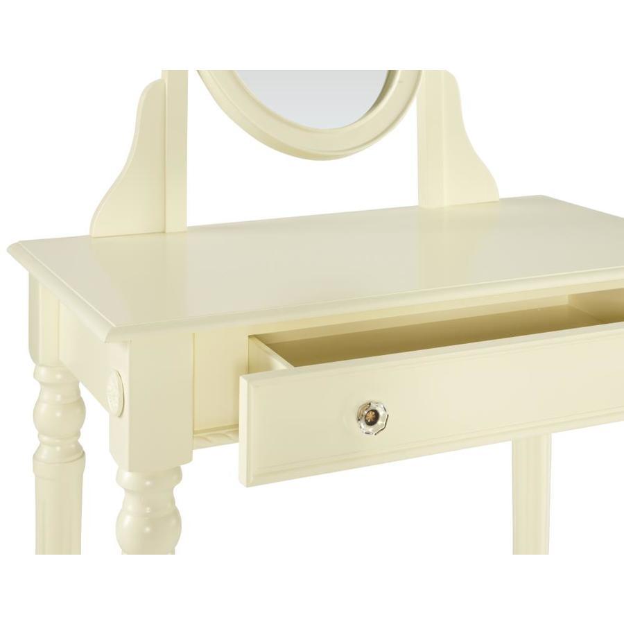 Adjustable mirror Plush, padded stool Intricately detailed spindle legs Acrylic pull knobs, large drawer