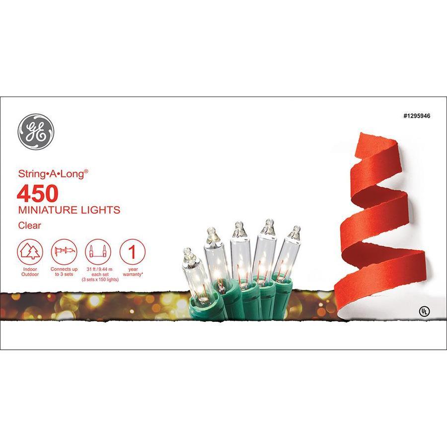 GE String-A-Long 450-count clear light string set 3 Strands of 150 lights each for a total of 93.12-feet of lighted length Can connect up to 3 sets For indoor or outdoor use Replacement bulbs and fuses included for added convenience Available only at ARB265W