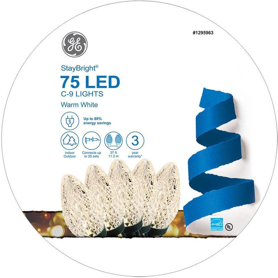 75-Count GE StayBright LED warm white C9 Christmas string lights Green cord with 37-feet lighted length matches your Christmas decor and illuminates your home's interior or exterior Can connect with up to 25 sets to make decorating your home a breeze Replacement bulbs and fuses included for added convenience ENERGY STAR qualified products help you save money on utility bills without sacrificing performance, style or comfort Available only at ARB265W