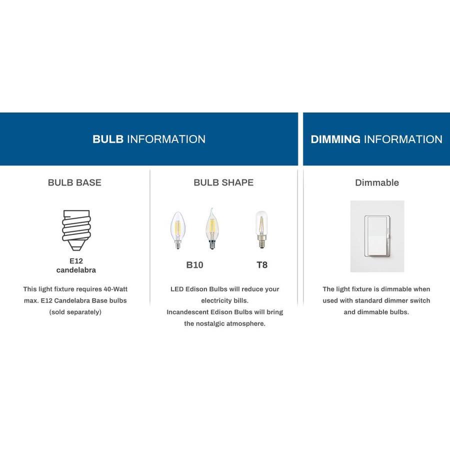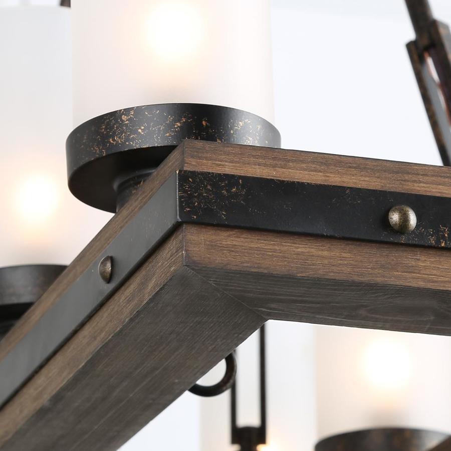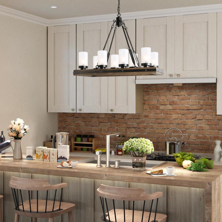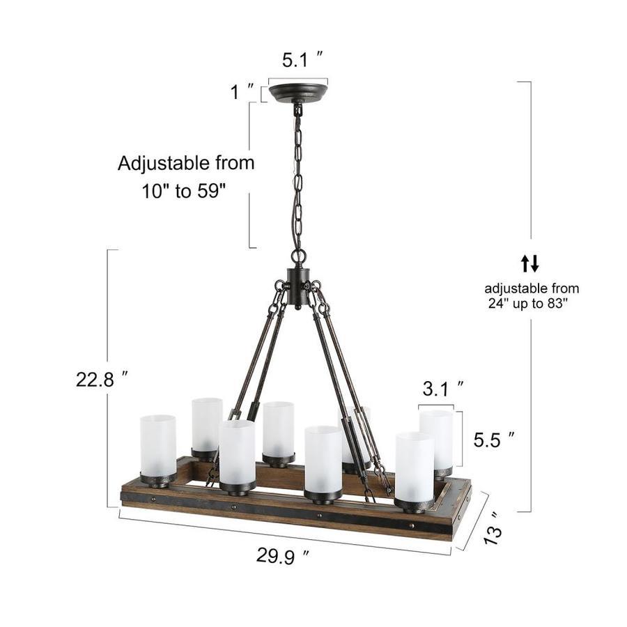 An accent modern farmhouse chandelier presents a rectangular wood frame with eight cylindrical frosted glass shade to bring you with the modern farmhouse and vintage style This classic chandelier lighting also take as kitchen island pendant lighting, which designed to work on all ceilings including flat, sloped, slanted or vaulted ceiling Adjustable lighting fixture dimensions: 30-in W x 13-in D x 23.8-in H Canopy dimensions: φ5.14inches x 1-in H and glass shade size: φ3.1 inches x 5.5 inches This modern farmhouse lighting requires eight 40-watt E12 candelabra base bulbs (not included), B10 bulb recommend Capable of being dimmed when used with a dimmable bulb and compatible dimmer switch Great for farmhouse, modern, country,rustic country style, widely used for your dining areas, staircase, entryway,foyer, kitchen and living and bedroom, perfect match with different style furniture of your home UL listed hardwired lighting,easy installation, detailed instructions and all mounting hardware are included