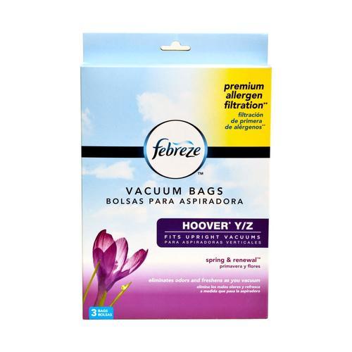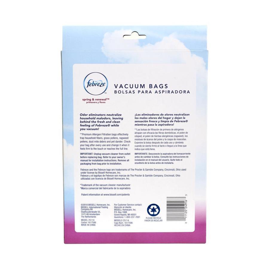Odor eliminators neutralize household malodors, leaving behind the fresh, clean feeling of Febreze while you vacuumCertain trademarks used under license from The Procter and Gamble Company or its affiliates Premium Allergen Filtration bags effectively trap household fibers, grass pollens, ragweed pollens, dust mite debris and pet dander To maximize performance and extend the life of your vacuum, vacuum bags should be changed regularly Package Includes: 3 Febreze Spring and Renewal Vacuum Bags