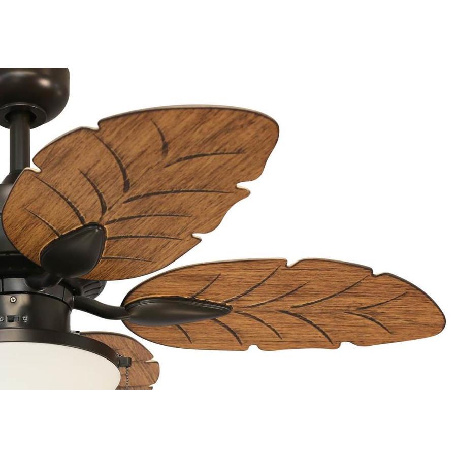 Weathered bronze finish indoor/outdoor ceiling fan from the Waveport collection features 5 brown blades in a tropical, palm style design