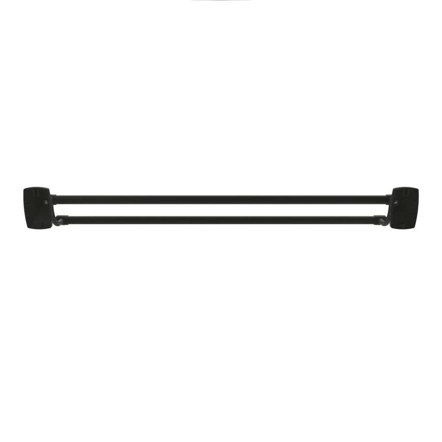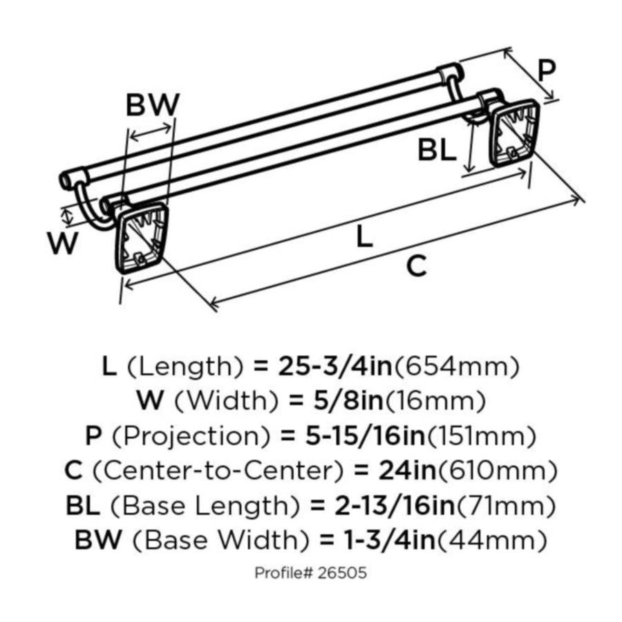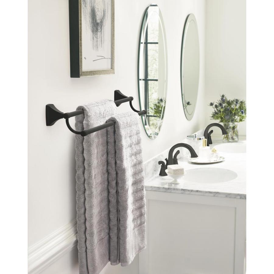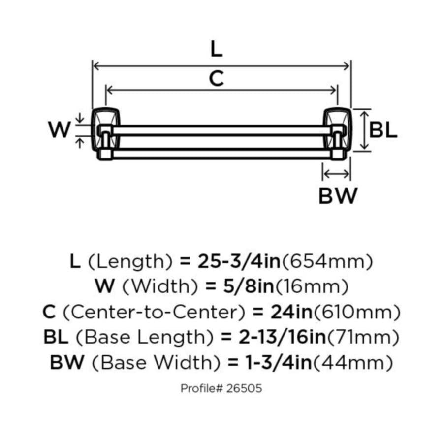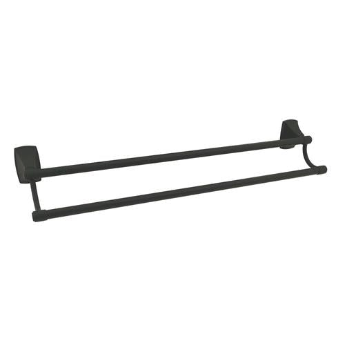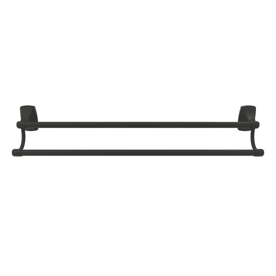24 in (610 mm) Double Double Towel Bar Finished in Matte Black Coordinates perfectly with matching Amerock cabinet hardware finishes Includes mounting hardware: (Size(s):#8 x 1-1/4-in Sheet Metal Screw) Complete with Amerock Guardian Lifetime Guarantee against defect in material and workmanship Complete the look for your entire bathroom with matching pieces from the Clarendon Collection