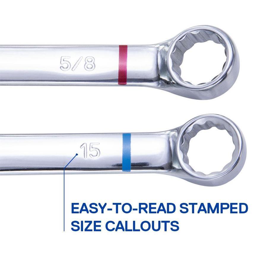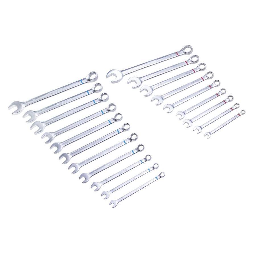 Twenty standard length wrenches include 6, 7, 8, 9, 10, 11, 12, 13, 14, 15 and 17mm as well as 1/4, 5/16, 11/32, 3/8, 7/16, 1/2, 9/16, 5/8 and 3/4-inch