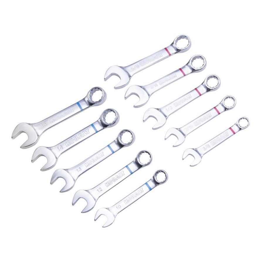 Ten stubby wrenches include 10, 12, 13, 14 and 15mm as well as 3/8, 7/16, 1/2, 9/16 and 5/8-inch
