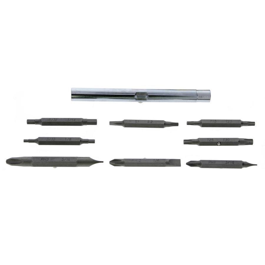 Bits included: #1 Phillips, #2 Phillips, #3 Phillips, 3/16 in. slotted, 1/4 in. slotted, 5/16 in. slotted, #1 square, #2 square, #15 star, #20 star, #25 star, #30 star, 3/32 in. hex, 1/8 in. hex, 3/16 in. hex, 5/32. in hex