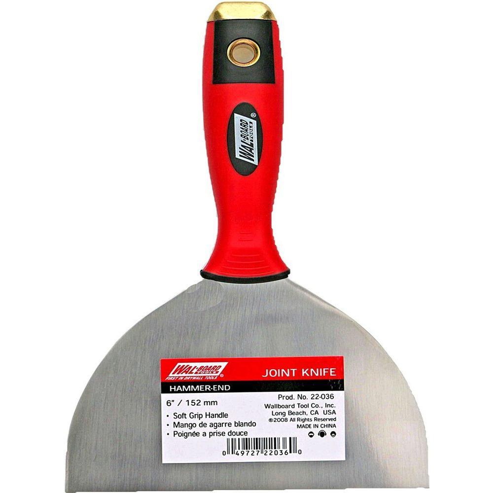 The Wal-Board Tools 4 in. Hammer-End Joint Knife features a high-carbon steel blade for flexibility and a smooth, feathered finish. The Hammer-End allows for proper nail setting, lending the tool versatility. This joint knife easily resists wear, abrasion and most common paint thinners for a durable tool.