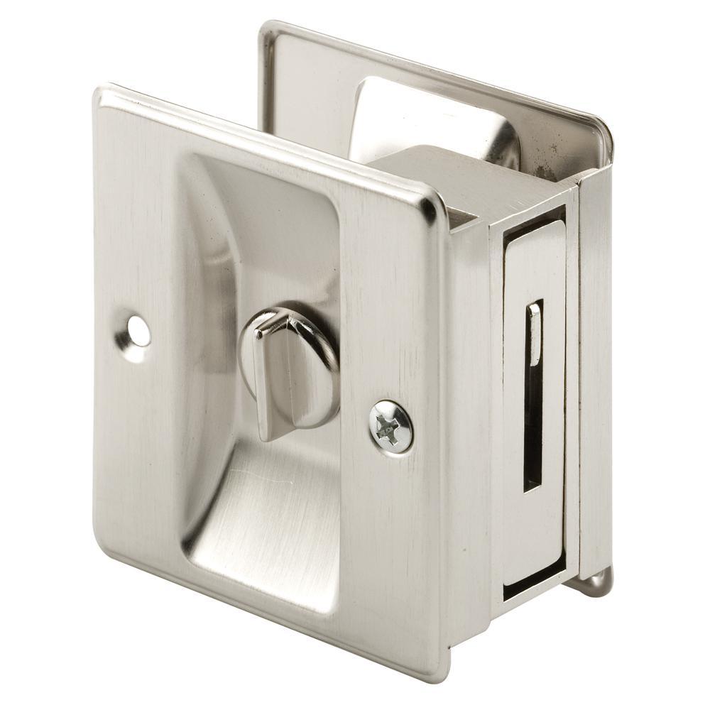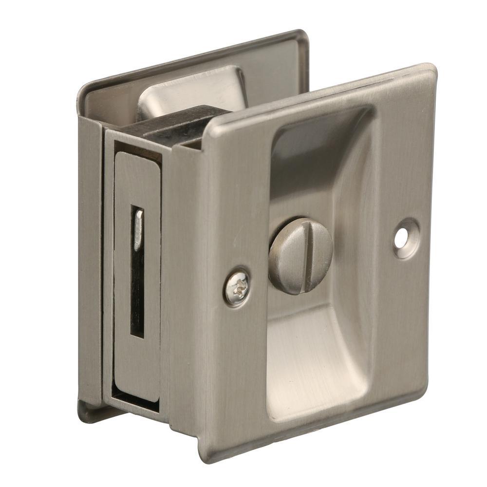 This is a privacy lock and pull for a pocket door in satin nickel. These are designed to fit pocket doors from 1 3/8 in. to 1 3/4 in. thick. They are also designed to be reversible.