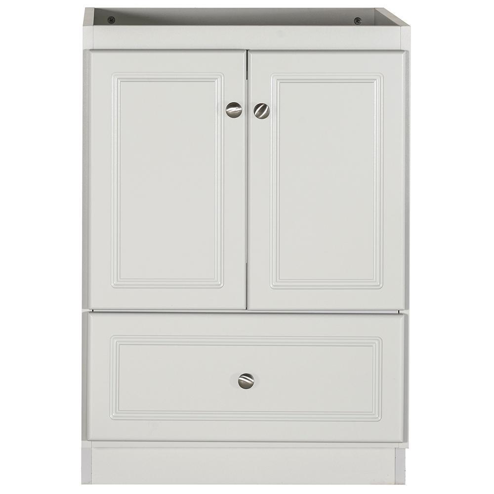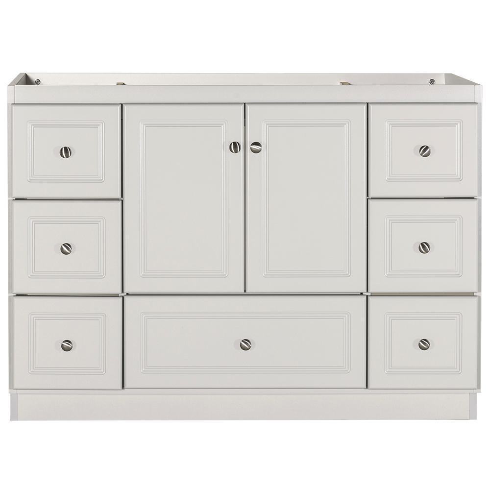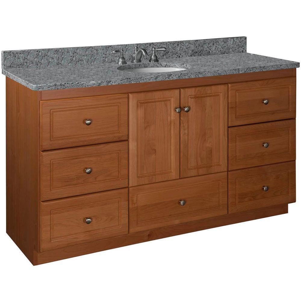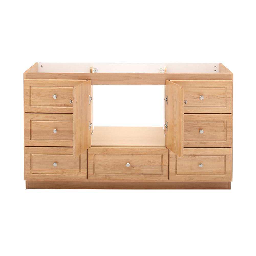 - Accommodates a 61 in. W x 22 in. D top with center basin (top and faucets not included)