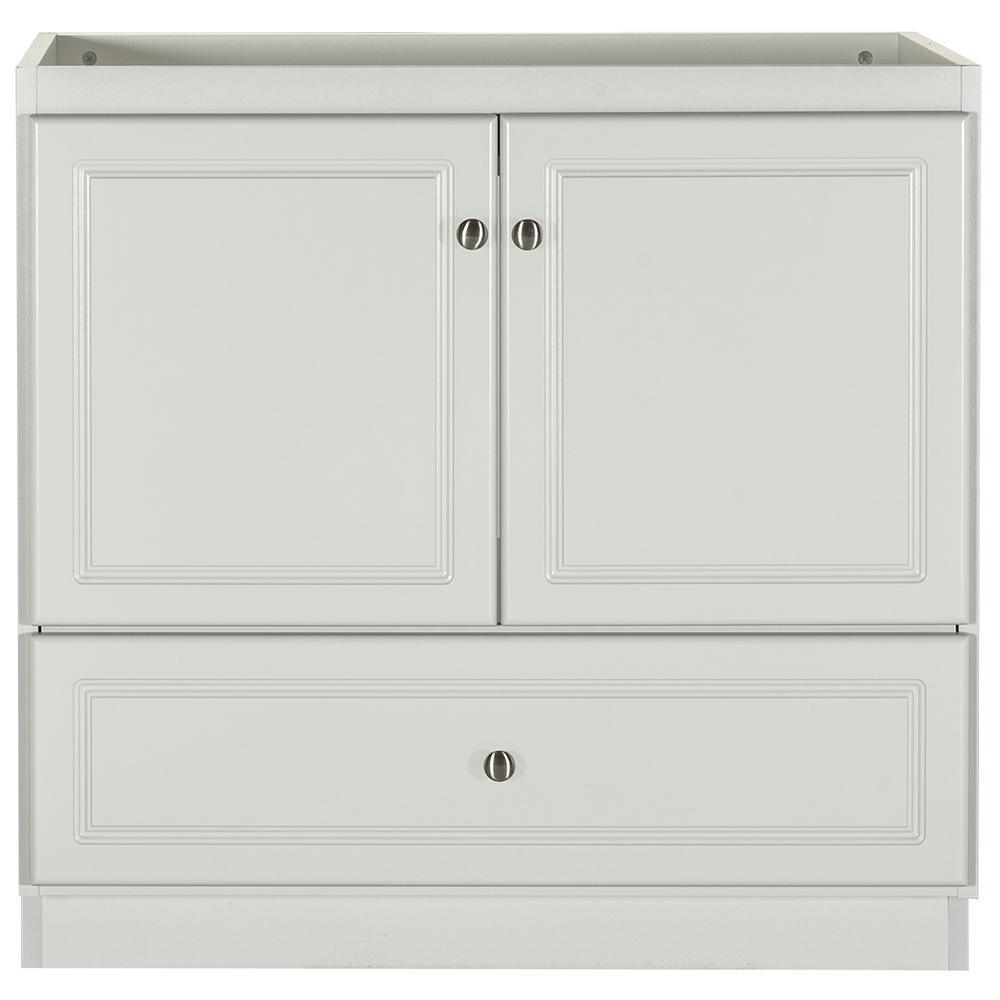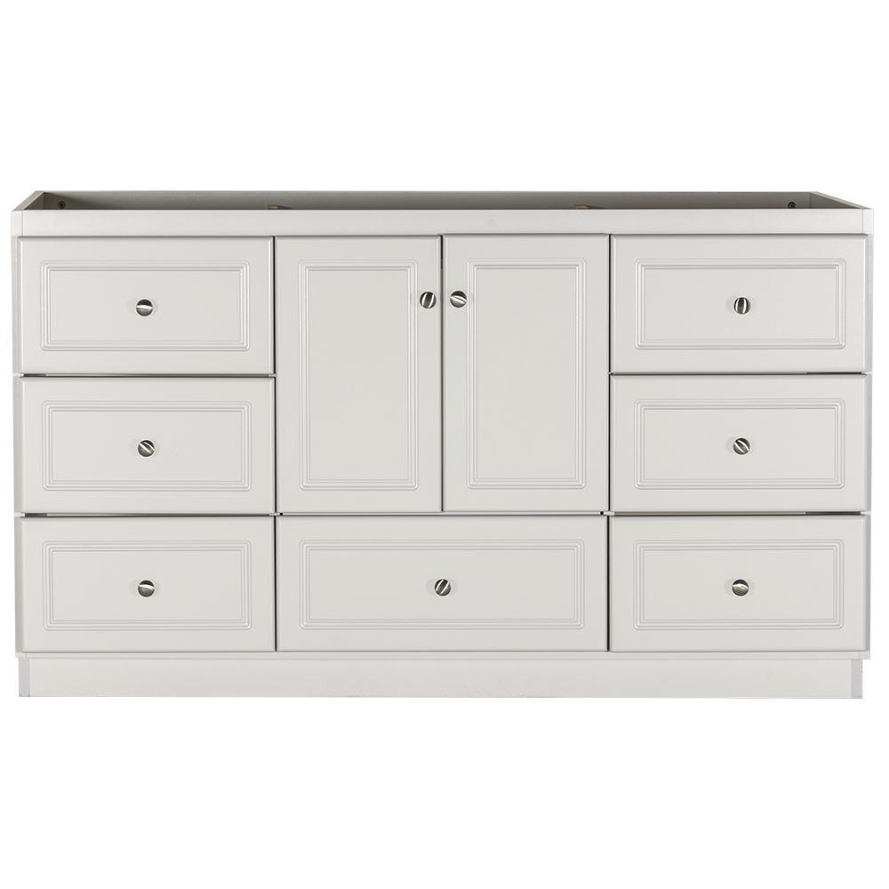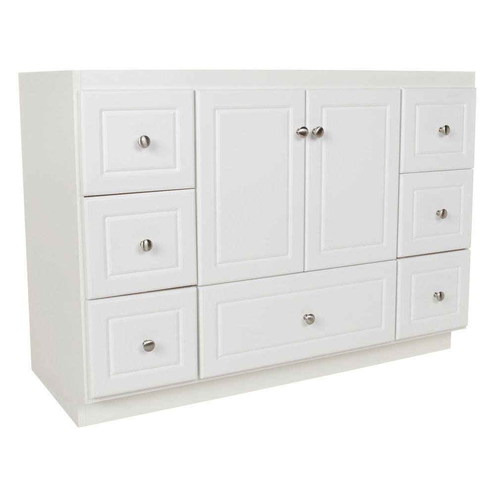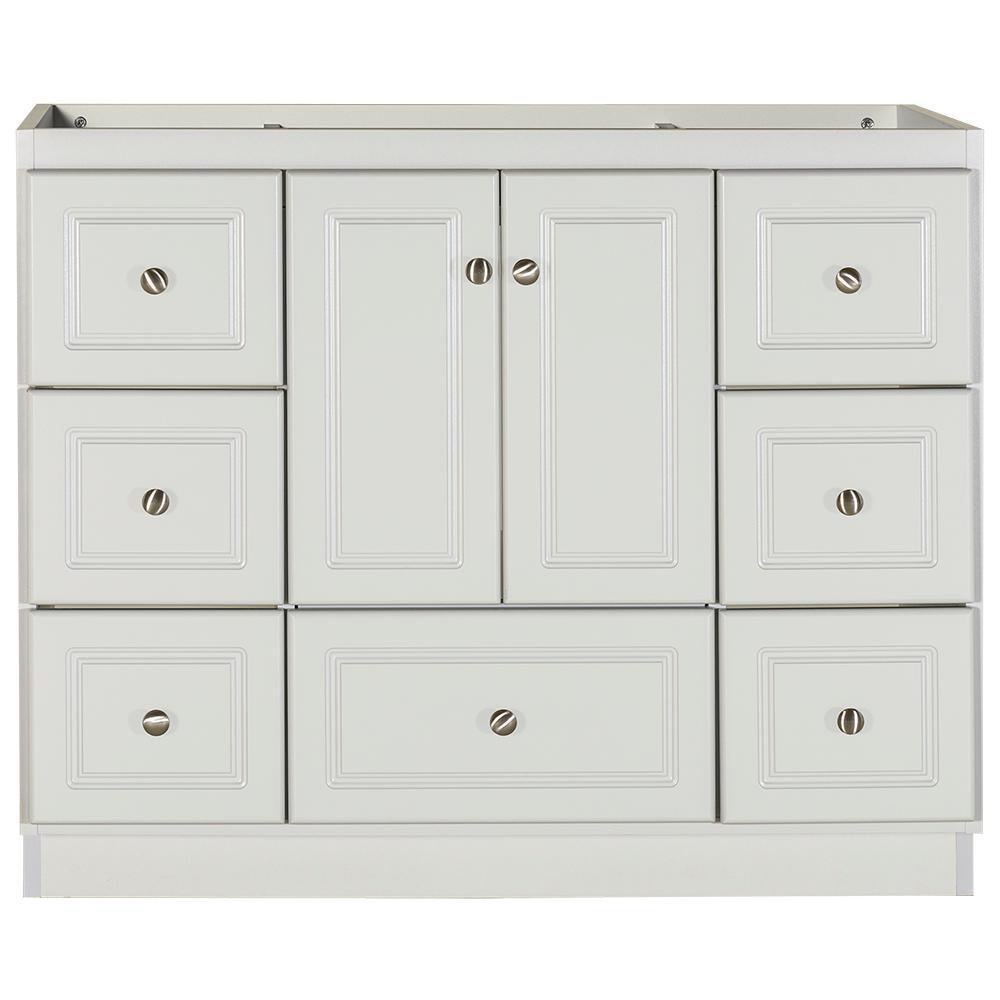 • Accommodates a 43 in. W x 22 in. D top with center basin (top and faucets not included)