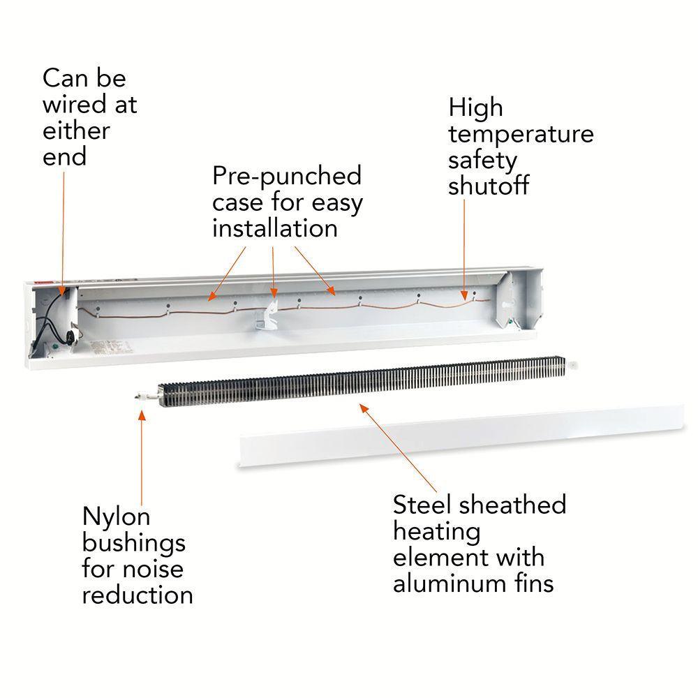 The Cadet Electric Baseboard Heater utilizes convection heat to provide efficient warmth. The quiet operation, and low cost installation make it a perfect choice for a bedroom or any area of your home that requires additional warmth. Designed for ease of installation with pre-punched mounting holes, this hardwired heater can be wired at either end. Rugged U.S.A. steel construction with powder coated white paint for a durable, premium finish. A thermostat is required and sold separately.
