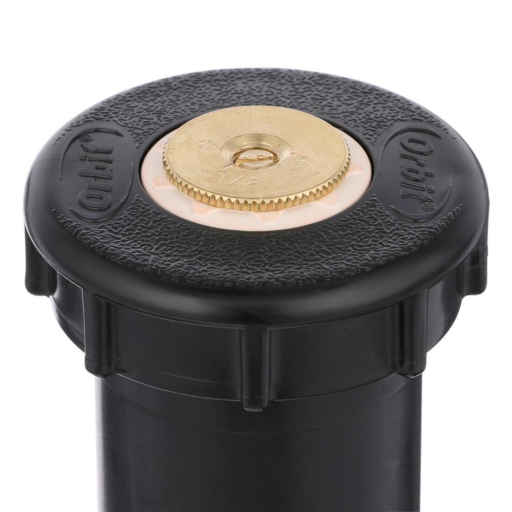 This Orbit Plastic 1/2-Pattern Spring-Loaded Pop-Up Sprinkler with Twin-Spray Brass Nozzle features a 2 in. pop-up height. The Twin-Spray nozzle combines a full-distance spray with an under-spray pattern to help maximize coverage. Durable Brass Nozzle and High Impact Plastic Body provides years of dependable use. Universal Replaces or works with all pop-up sprinklers.