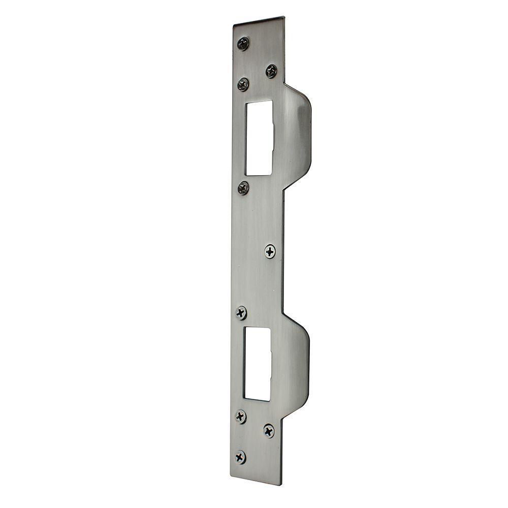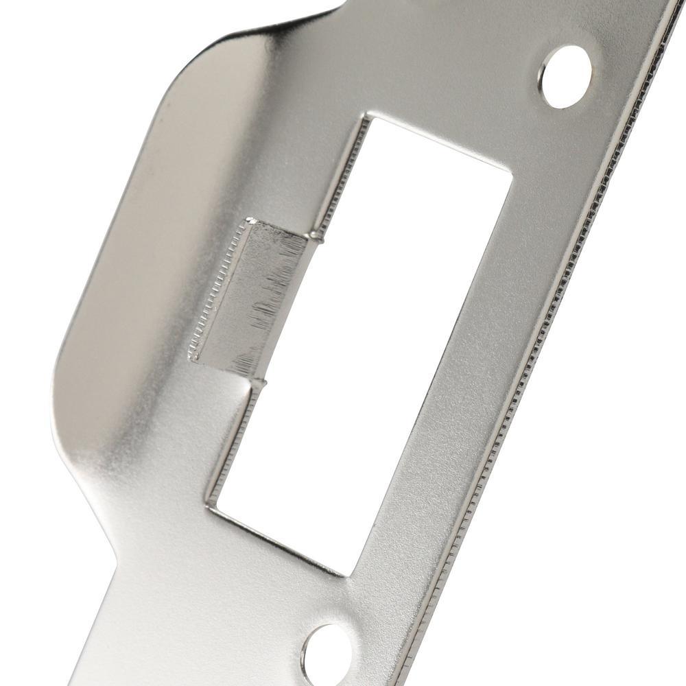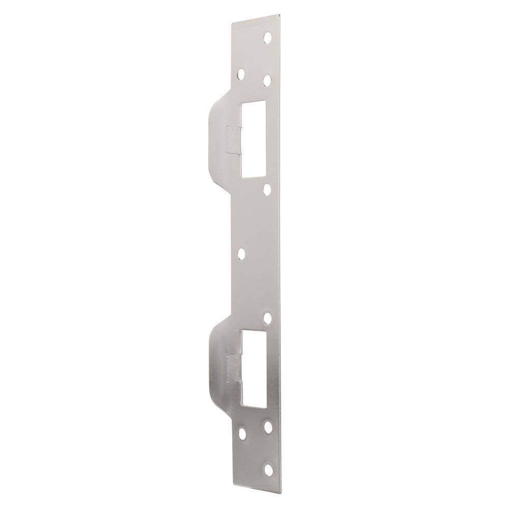 This Satin Nickel Security Latch Strike is designed to replace standard latch and deadbolt strikes with a single maximum security piece. Each kit includes six 3 in. long screws to attach to a wall stud for added security.