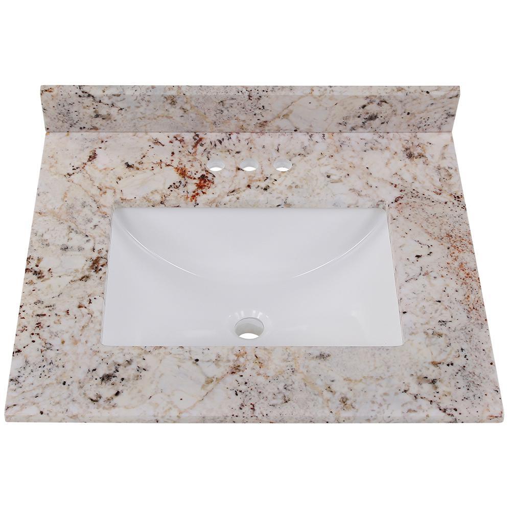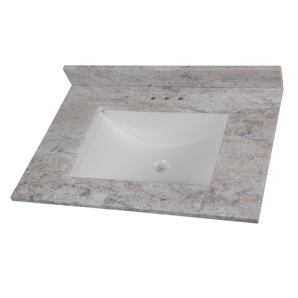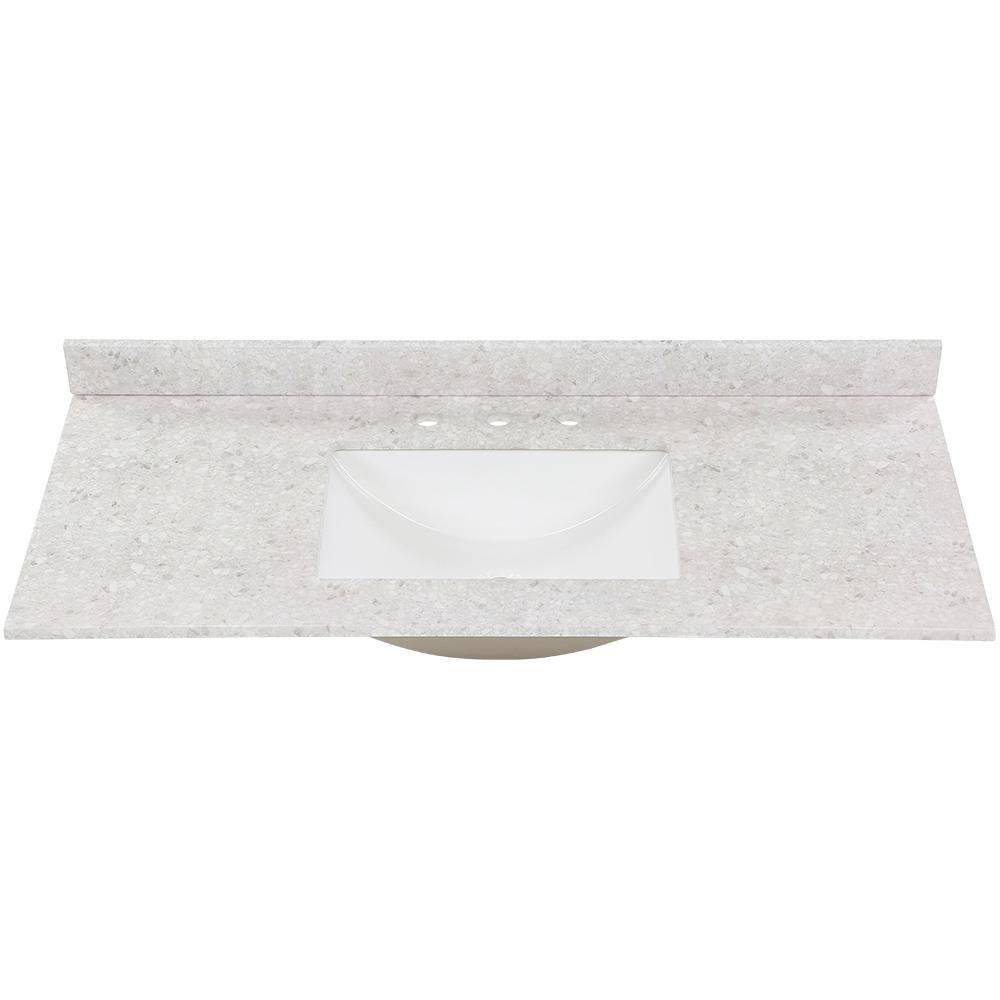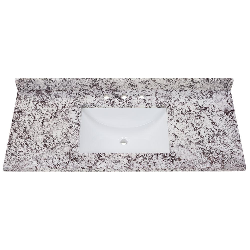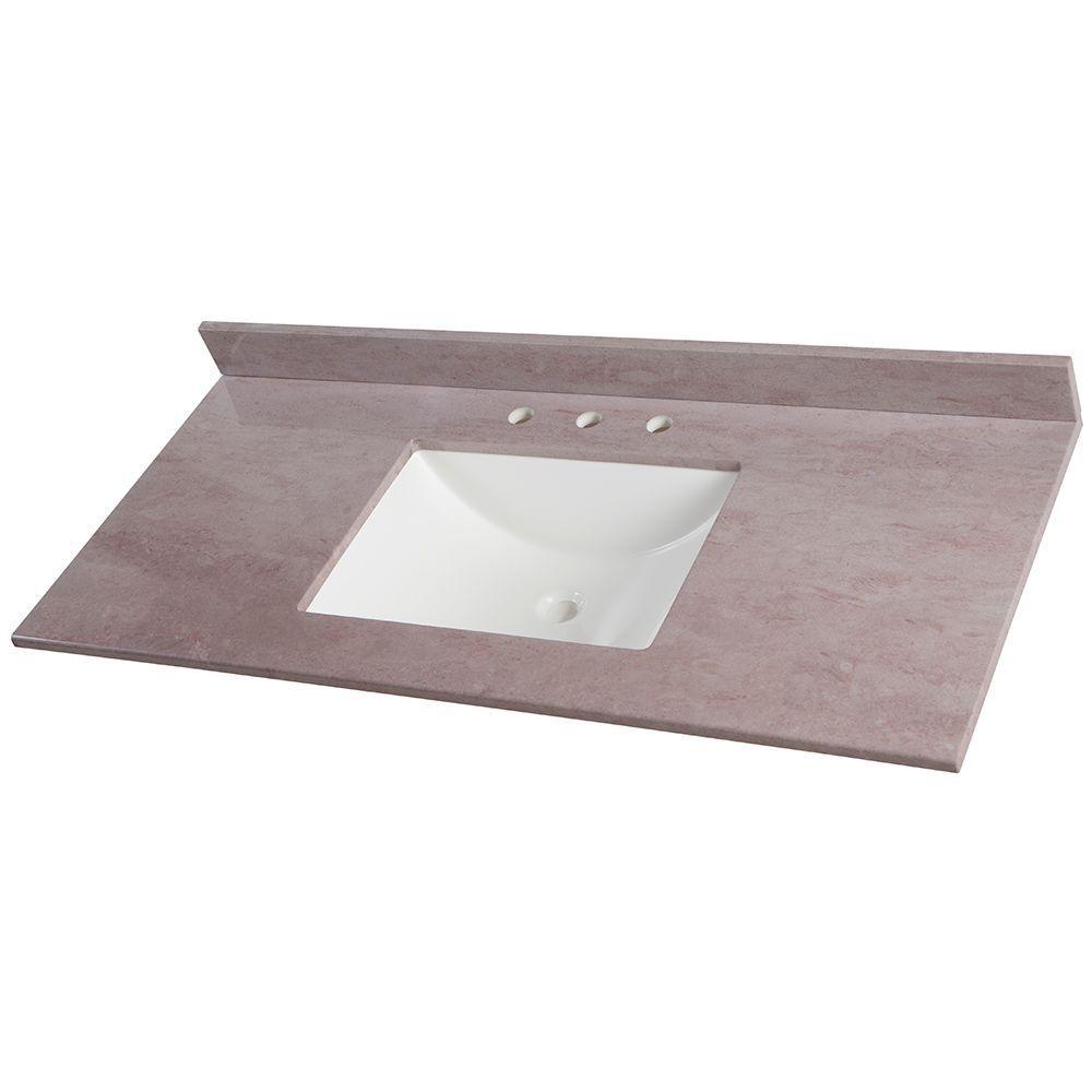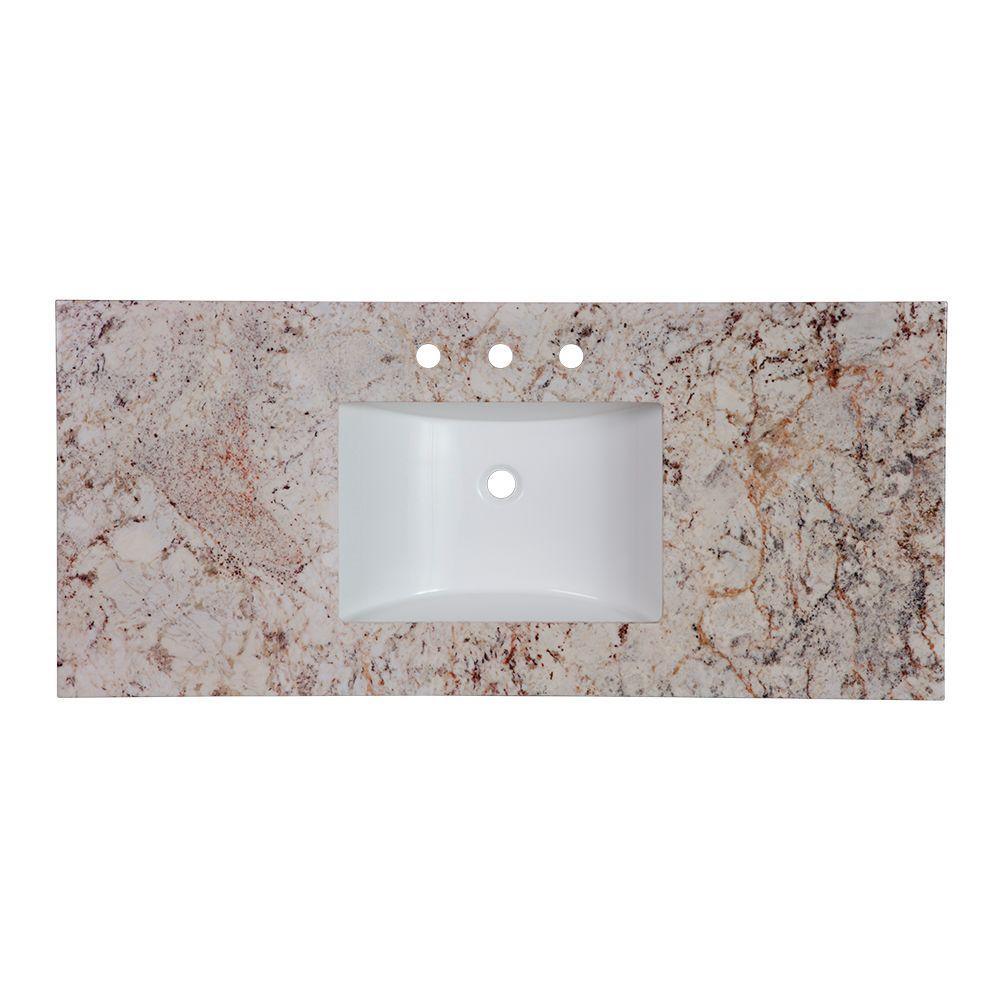 The Stone Effects 49 in. W Vanity Top in Rustic Gold features natural stone-like surface patterns that instantly add elegance and beauty to your bathroom. Coated with Diamond Shield, a surface coating that makes the vanity top resistant to stains, bacteria, mold and mildew; this durable vanity top is pre-attached to a white bowl for your convenience. The vanity top's 3-1/2 in. backsplash helps protect the wall and back of your cabinet against splashes and spills.