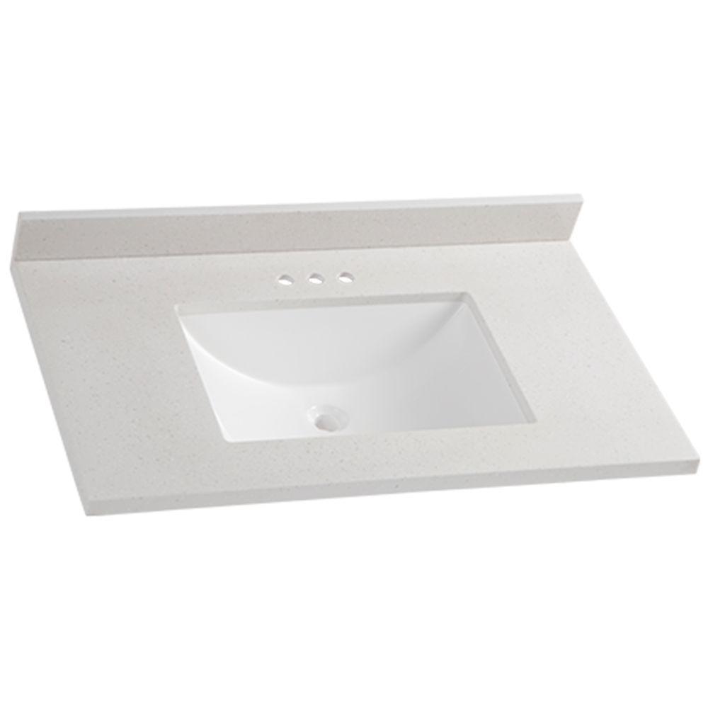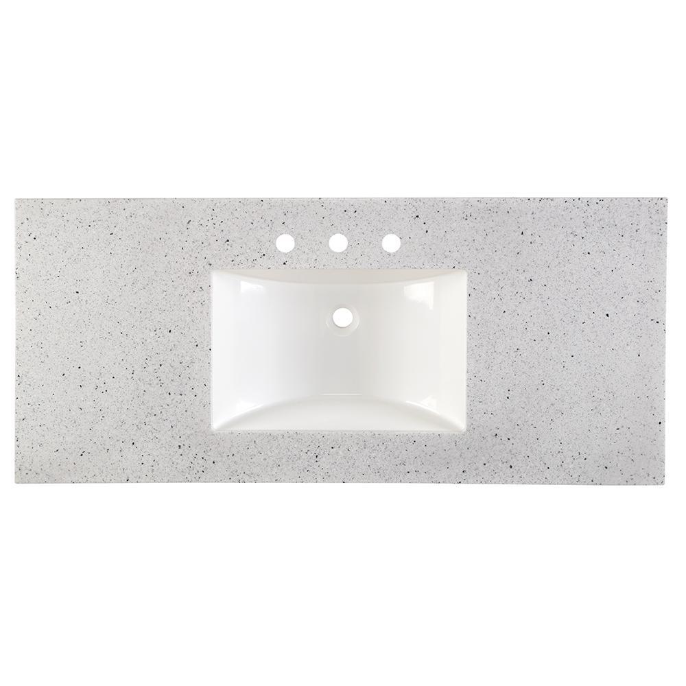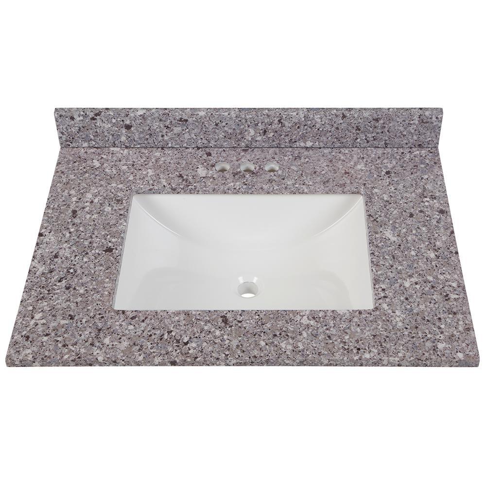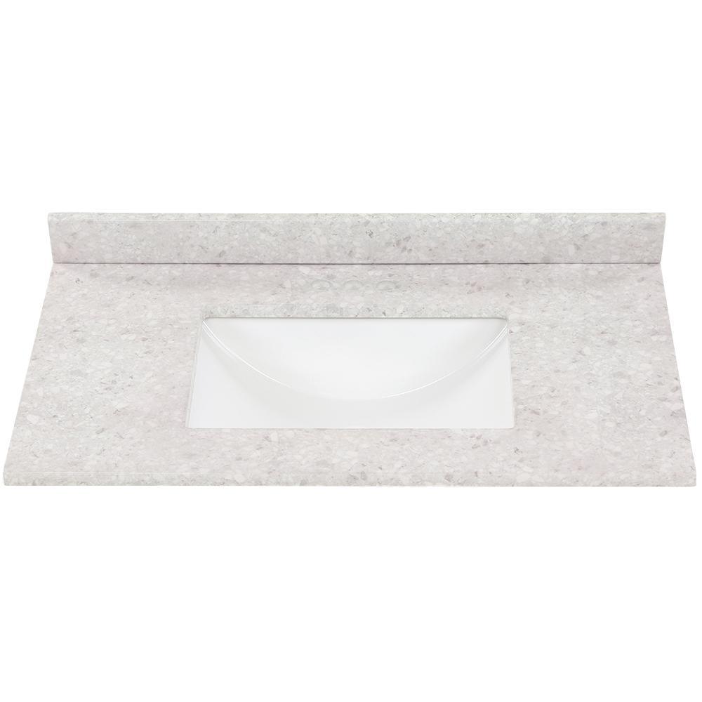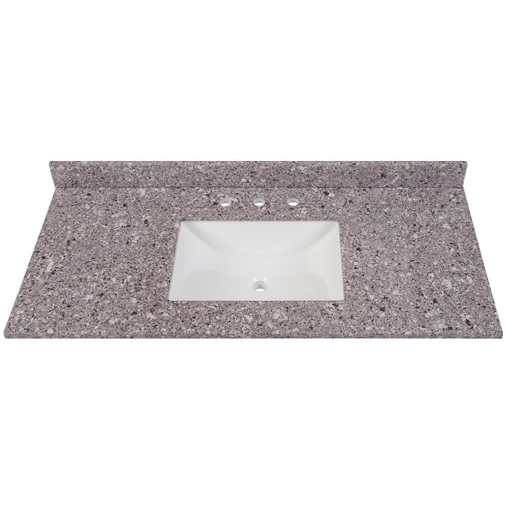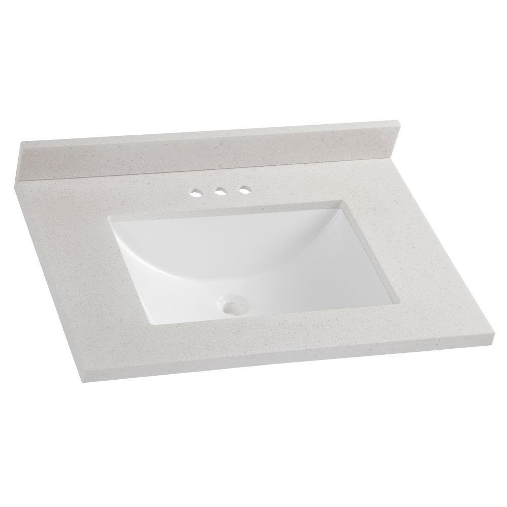 The Stone Effects 49 in. W Vanity Top in Rustic Gold features natural stone-like surface patterns that instantly add elegance and beauty to your bathroom. Coated with Diamond Shield, a surface coating that makes the vanity top resistant to stains, bacteria, mold and mildew; this durable vanity top is pre-attached to a white bowl for your convenience. The vanity top's 3-1/2 in. backsplash helps protect the wall and back of your cabinet against splashes and spills.