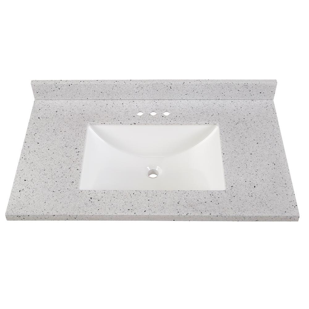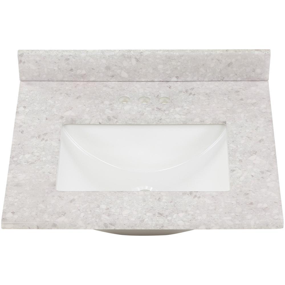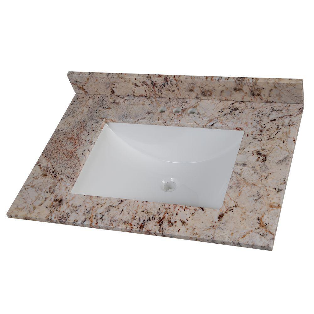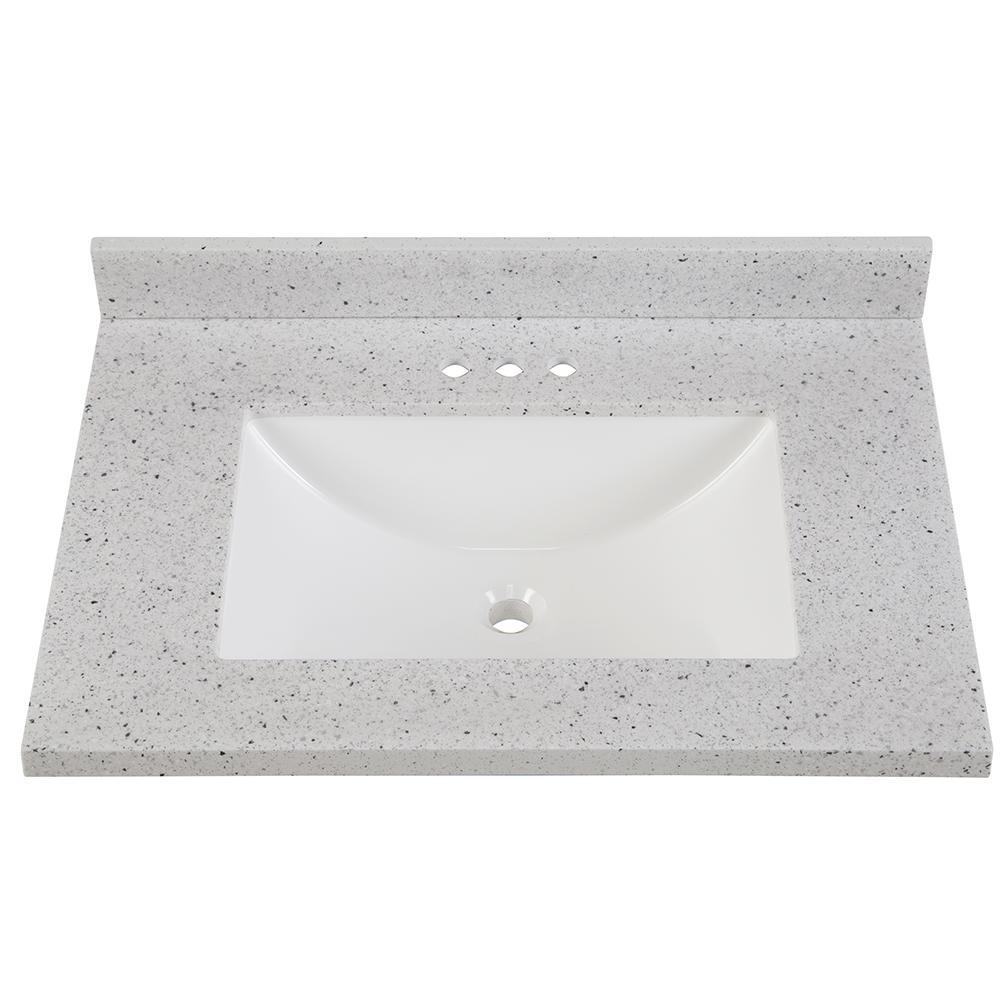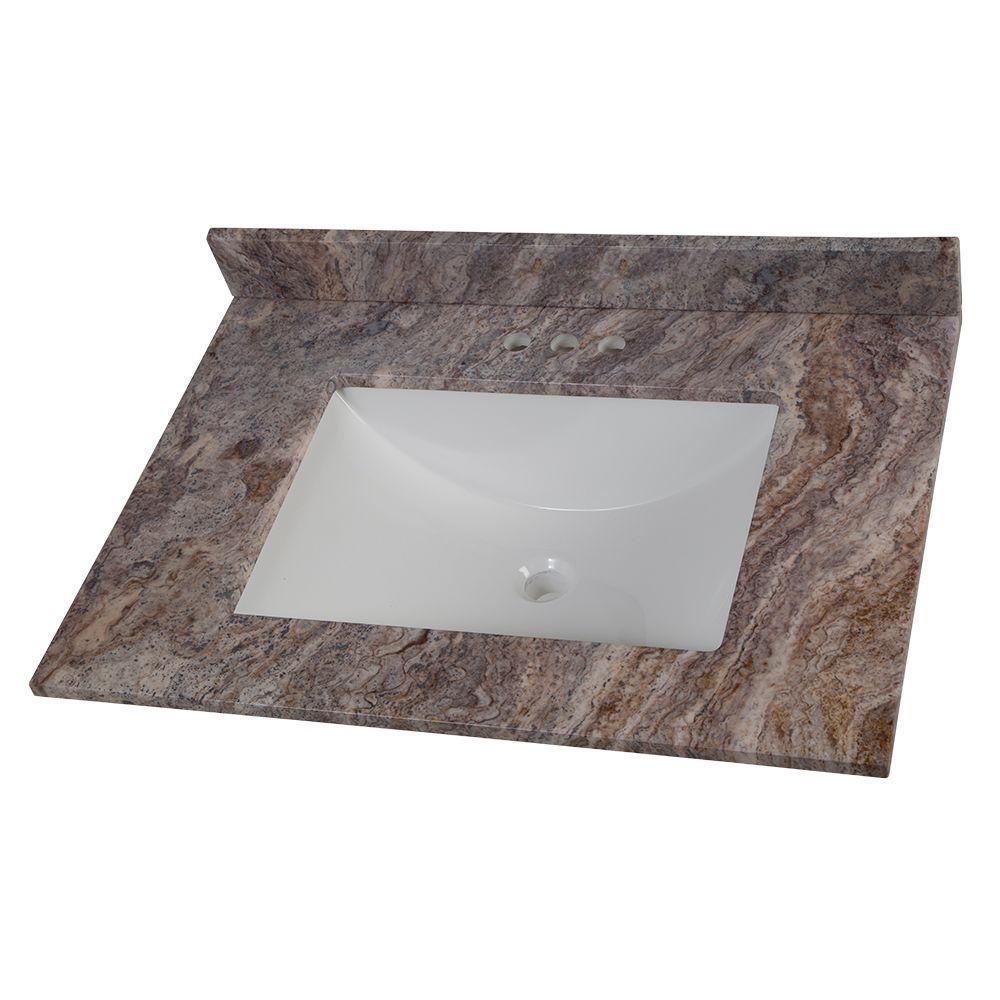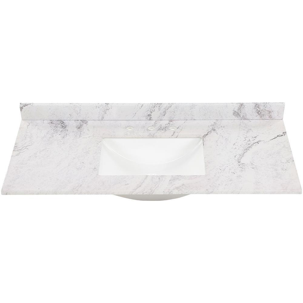 The Stone Effects 49 in. W Vanity Top in Rustic Gold features natural stone-like surface patterns that instantly add elegance and beauty to your bathroom. Coated with Diamond Shield, a surface coating that makes the vanity top resistant to stains, bacteria, mold and mildew; this durable vanity top is pre-attached to a white bowl for your convenience. The vanity top's 3-1/2 in. backsplash helps protect the wall and back of your cabinet against splashes and spills.