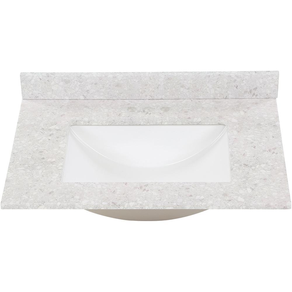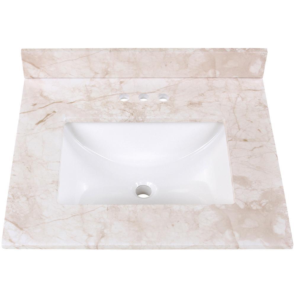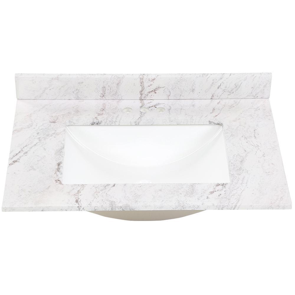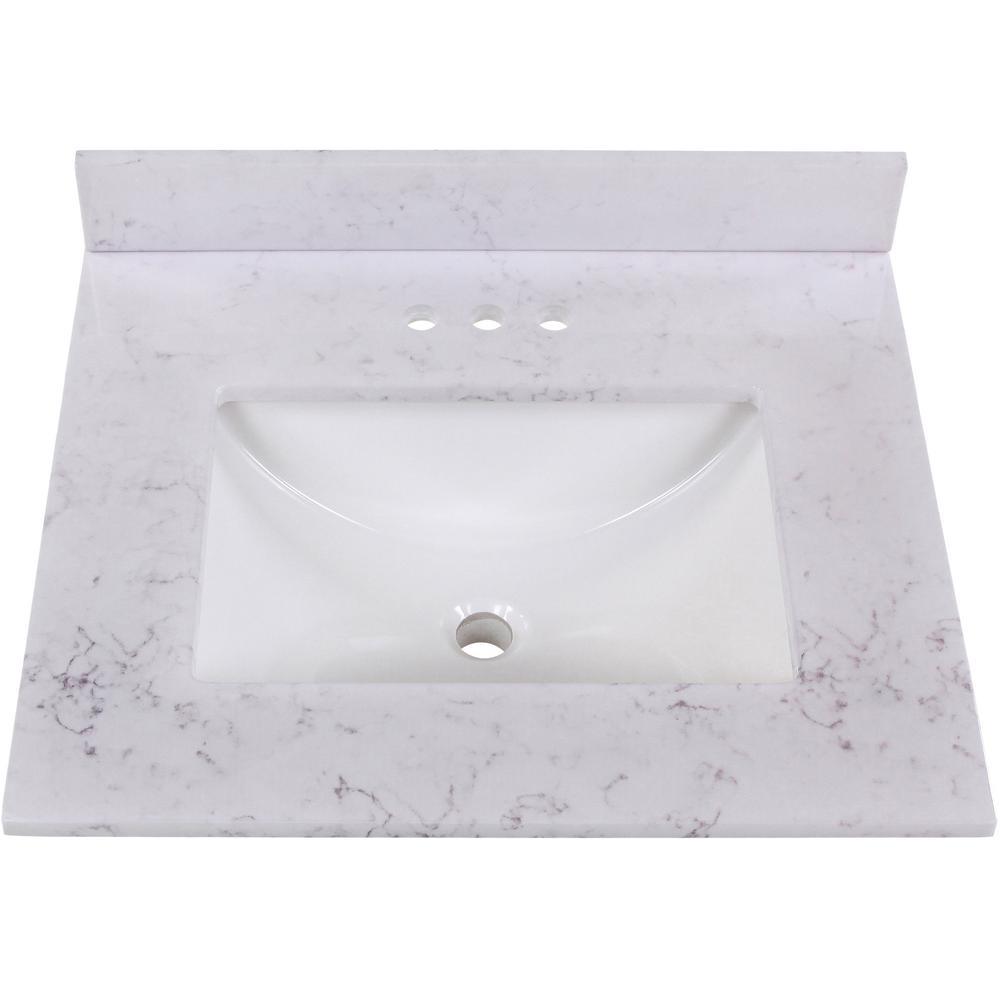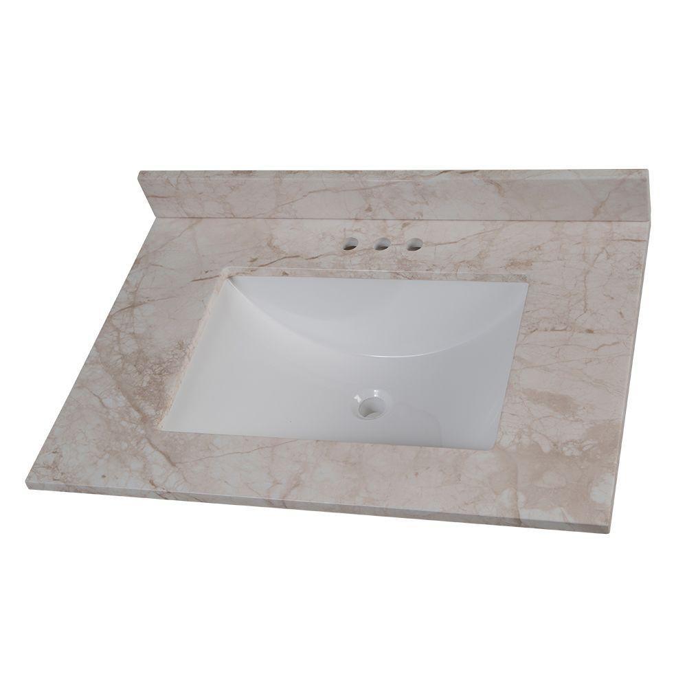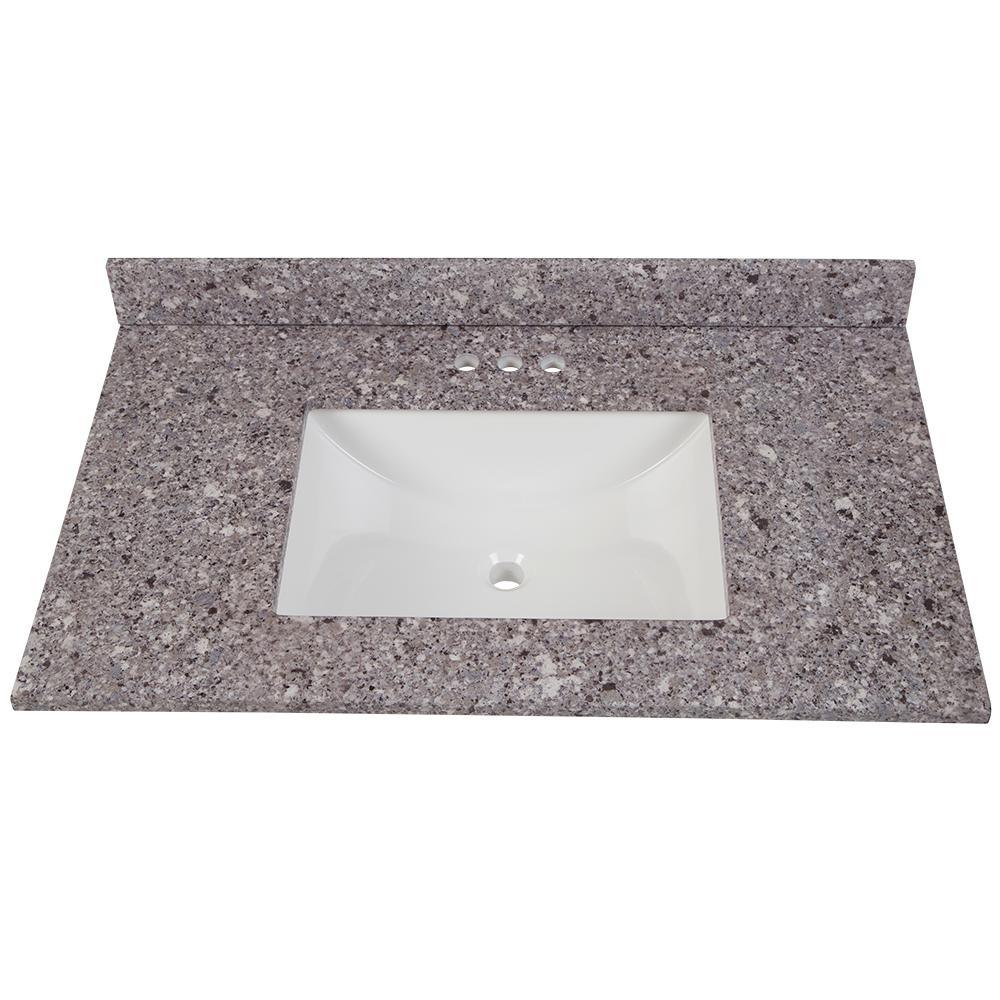 The Stone Effects 49 in. W Vanity Top in Rustic Gold features natural stone-like surface patterns that instantly add elegance and beauty to your bathroom. Coated with Diamond Shield, a surface coating that makes the vanity top resistant to stains, bacteria, mold and mildew; this durable vanity top is pre-attached to a white bowl for your convenience. The vanity top's 3-1/2 in. backsplash helps protect the wall and back of your cabinet against splashes and spills.