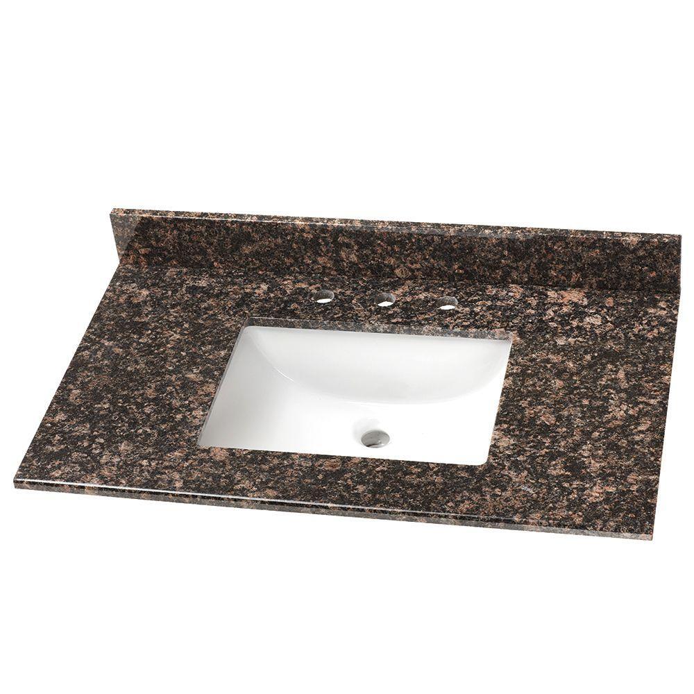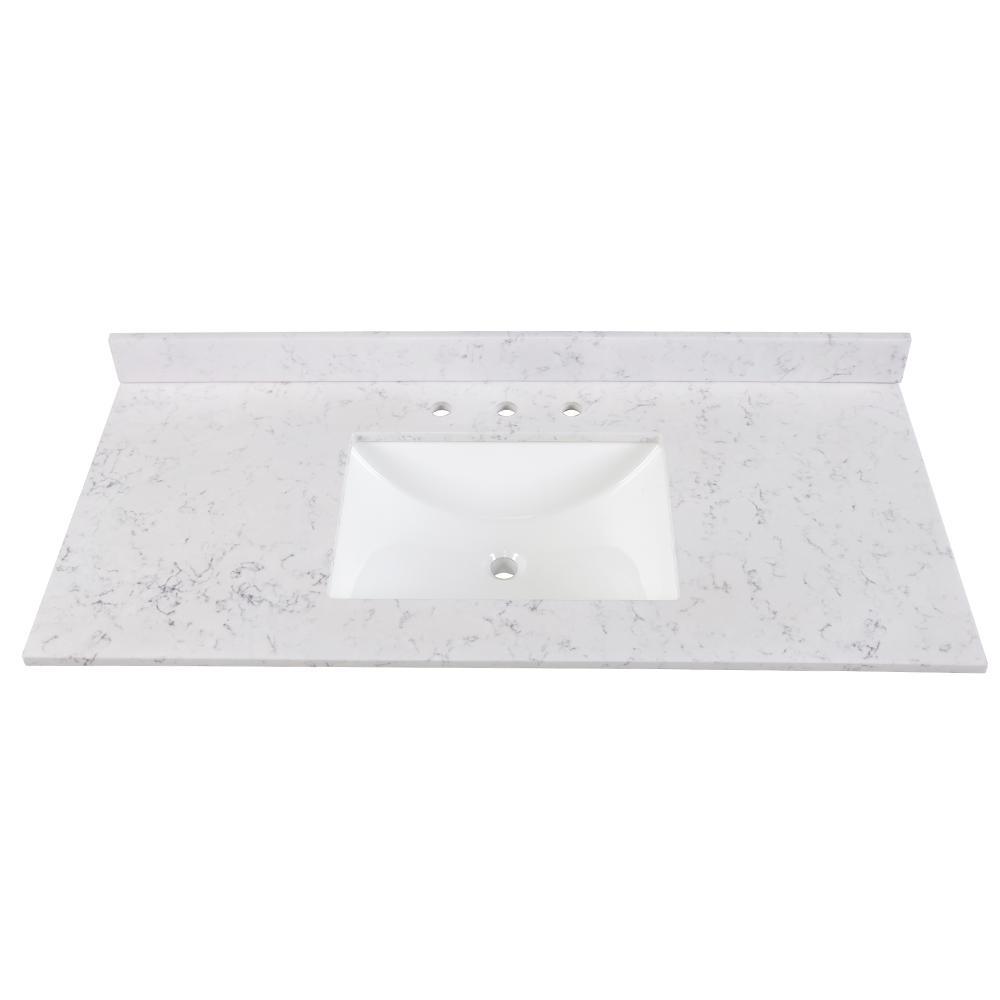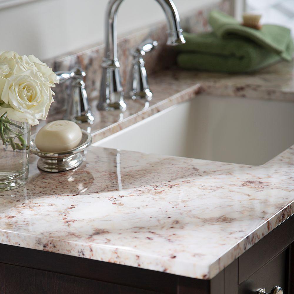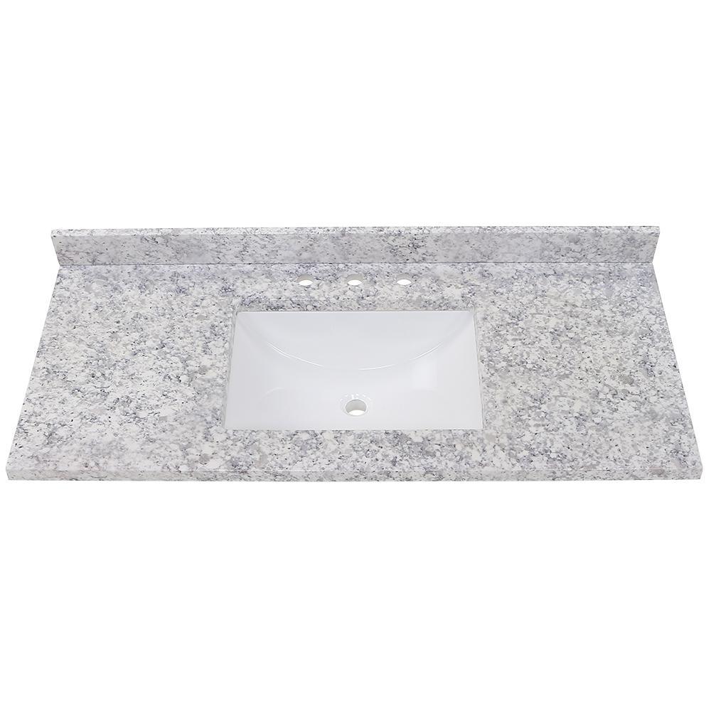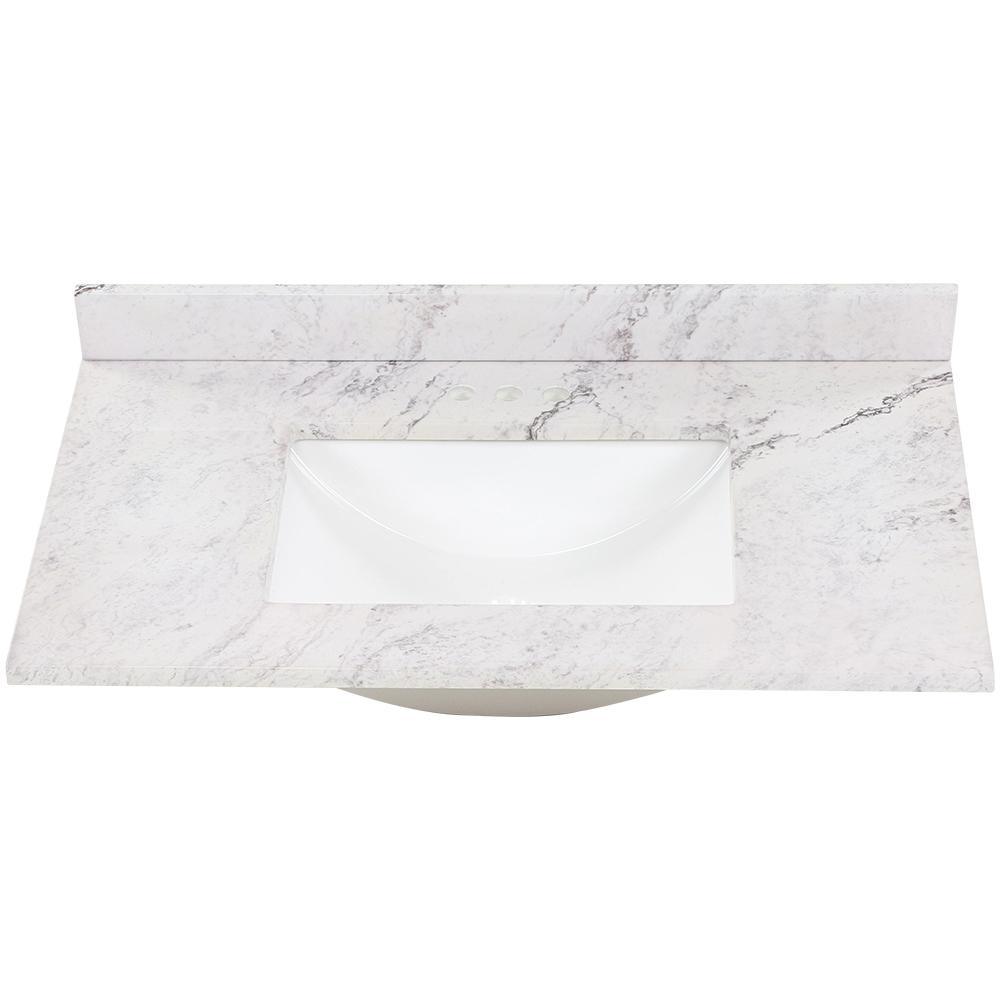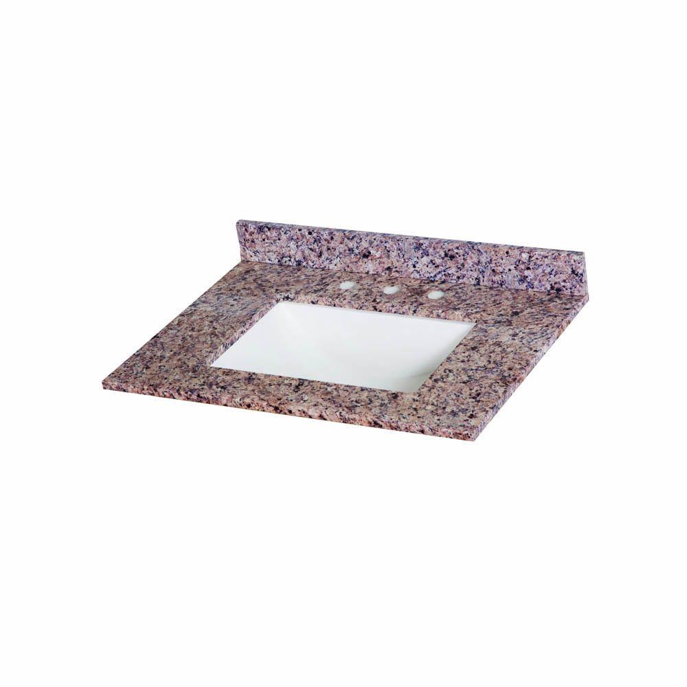 The Stone Effects 49 in. W Vanity Top in Rustic Gold features natural stone-like surface patterns that instantly add elegance and beauty to your bathroom. Coated with Diamond Shield, a surface coating that makes the vanity top resistant to stains, bacteria, mold and mildew; this durable vanity top is pre-attached to a white bowl for your convenience. The vanity top's 3-1/2 in. backsplash helps protect the wall and back of your cabinet against splashes and spills.