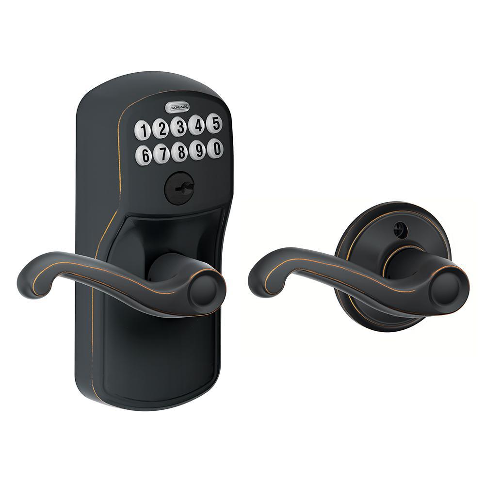 Eliminate the hassle of house keys with the Schlage Flair Aged Bronze Keypad Electronic Door Lever with Plymouth Trim. With this electronic door lever, you can control entry to your home more easily and securely, and our Auto-Lock feature automatically re-locks after 5 seconds of inactivity. The LED backlight keypad is able to hold up to 19 different user codes for your convenience, and features a low battery indicator. Also, this electronic keypad runs on a single 9-volt battery, which is included. All in a slim profile and stylish trim that pairs perfectly with interior hardware. The elegant Flair lever's ornate details are reminiscent of a paper scroll, while the Plymouth trim features an oval shape and straightforward design. Our Aged Bronze finish is inspired by traditional design, featuring warm, copper tones that break through its darker, aged exterior. Plus, it's been designed and tested with strength and durability in mind.