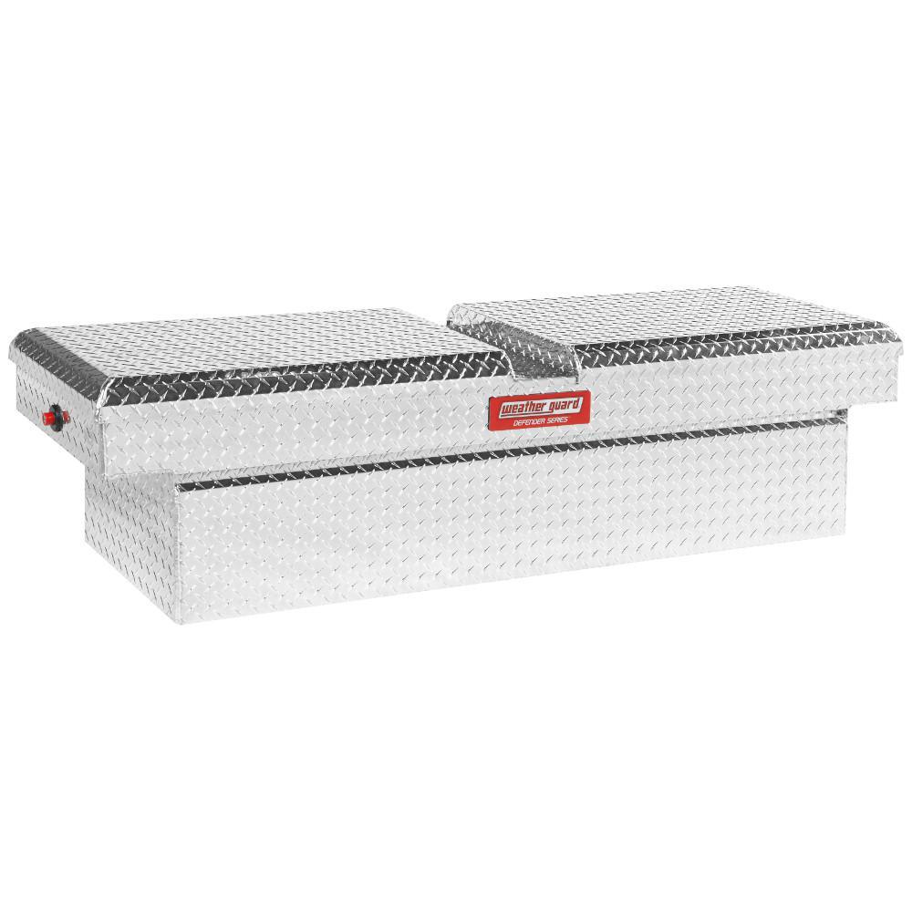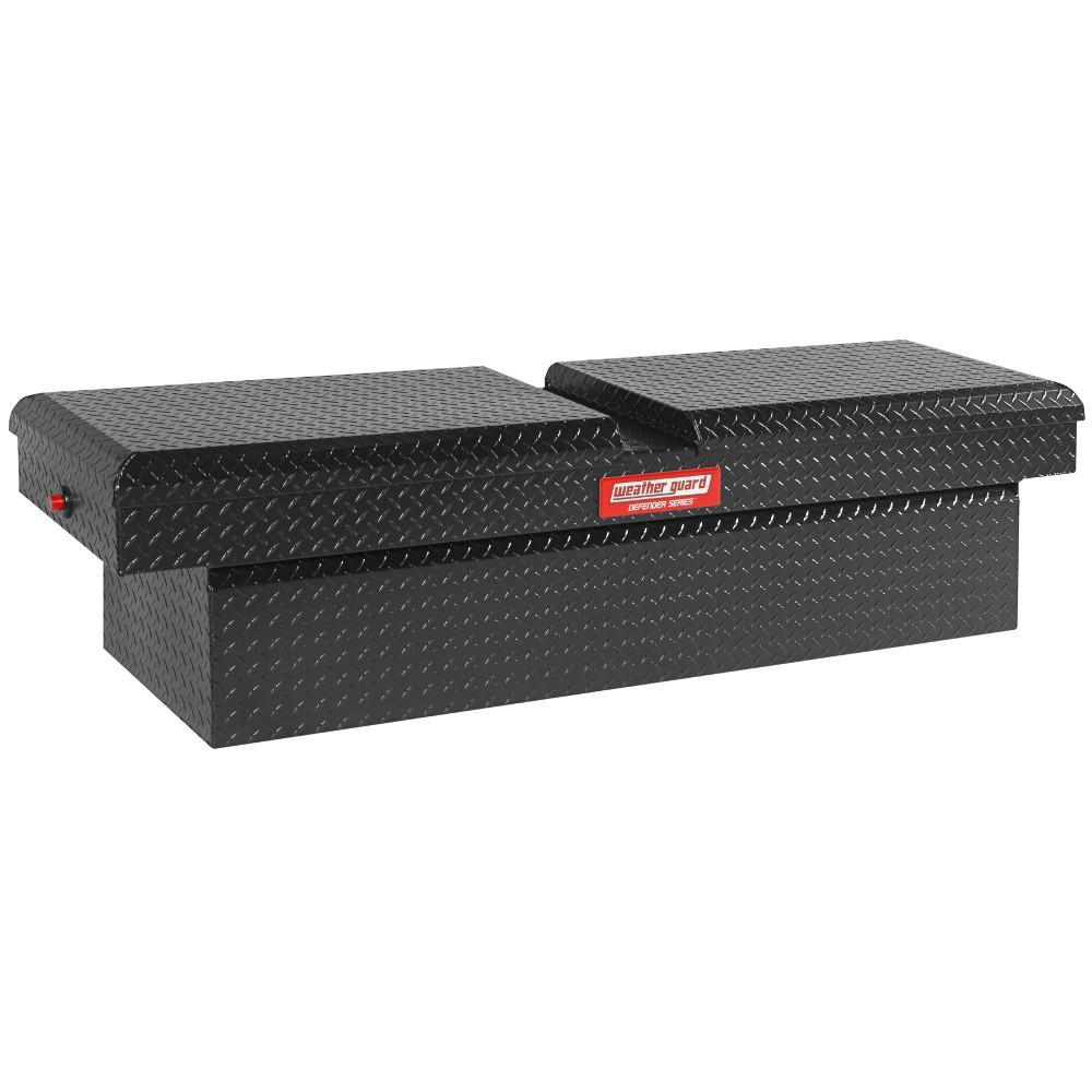 The 10.7 cu. ft. Weather Guard Defender series Model 300207-53-01 Cross Box for full size trucks provides professional protection. This new cross box includes a tamper-resistant push-button lock, steel reinforced, looped strikers, D-shaped ribbed weather stripping, heavy-duty 4-piece welded aluminum box construction and black powder coat finish. Provides professional durability with 4-piece welded construction putting strength where it is needed most.