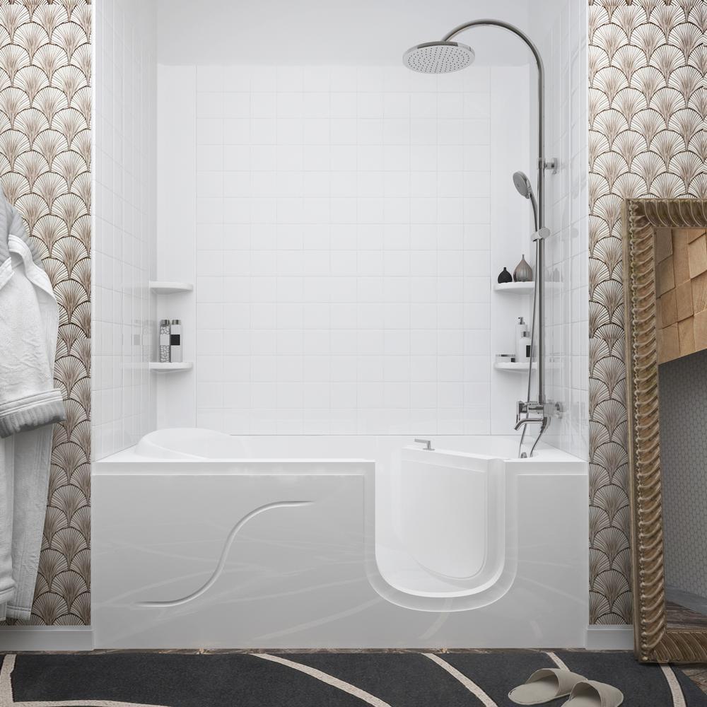 • Includes two (2) 60x60 in. 4 in. square tile rampart wall surround sheets, two (2) 60 in. tall corner caddies, ten (10) clear silicone tubes, double sided adhesive strips, two (2) caulking tubes, HDSI3060RWS Nova Heated walk-in bathtub