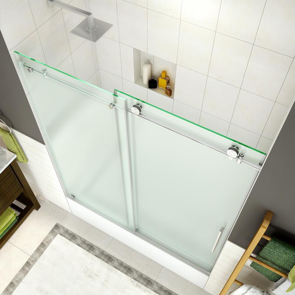 • 56 in. to 60 in. W x 60 in. H frameless sliding tub door with frosted glass