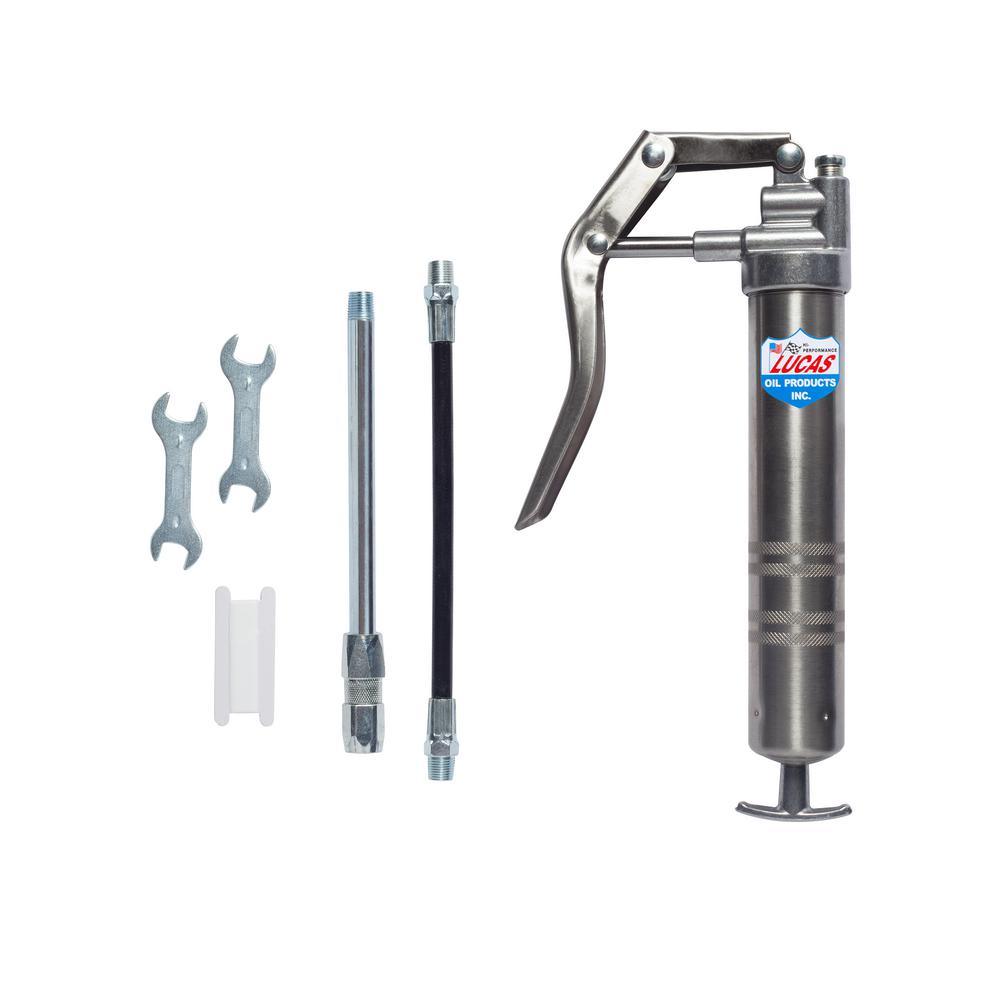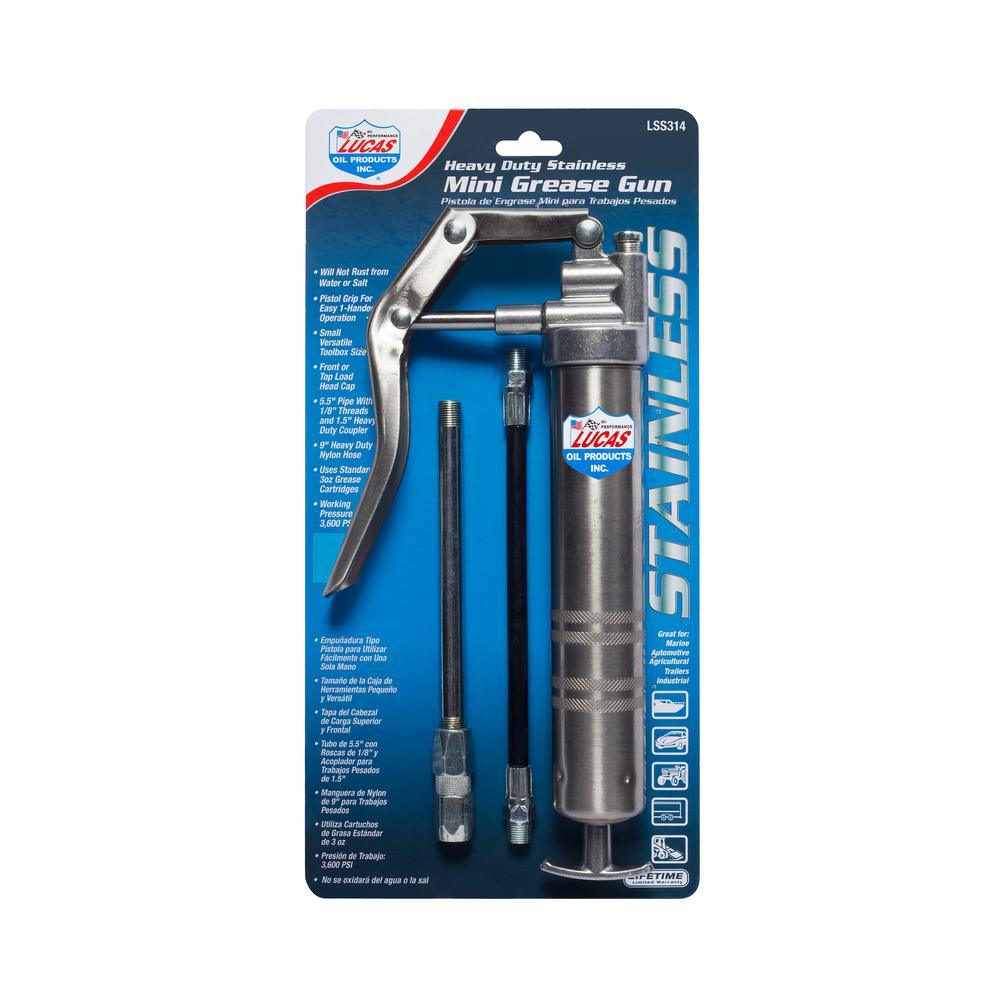 The Lucas Mini Marine Grease Gun is perfect for hard-to-reach jobs, delivering high-performance in a compact gun. The pistol action delivers up to 3,600 psi with a single-handed squeeze. The gun is built to last, using a combination of high-quality aluminum and stainless steel. The 3-way loading makes it easy to refill via tube, grease or bulk. As with every Lucas product, the Mini Marine Grease Gun is designed with best-in-class ergonomics. The Lucas Mini Marine Grease Gun is the perfect first mate to have on hand for marine and other small-space projects.