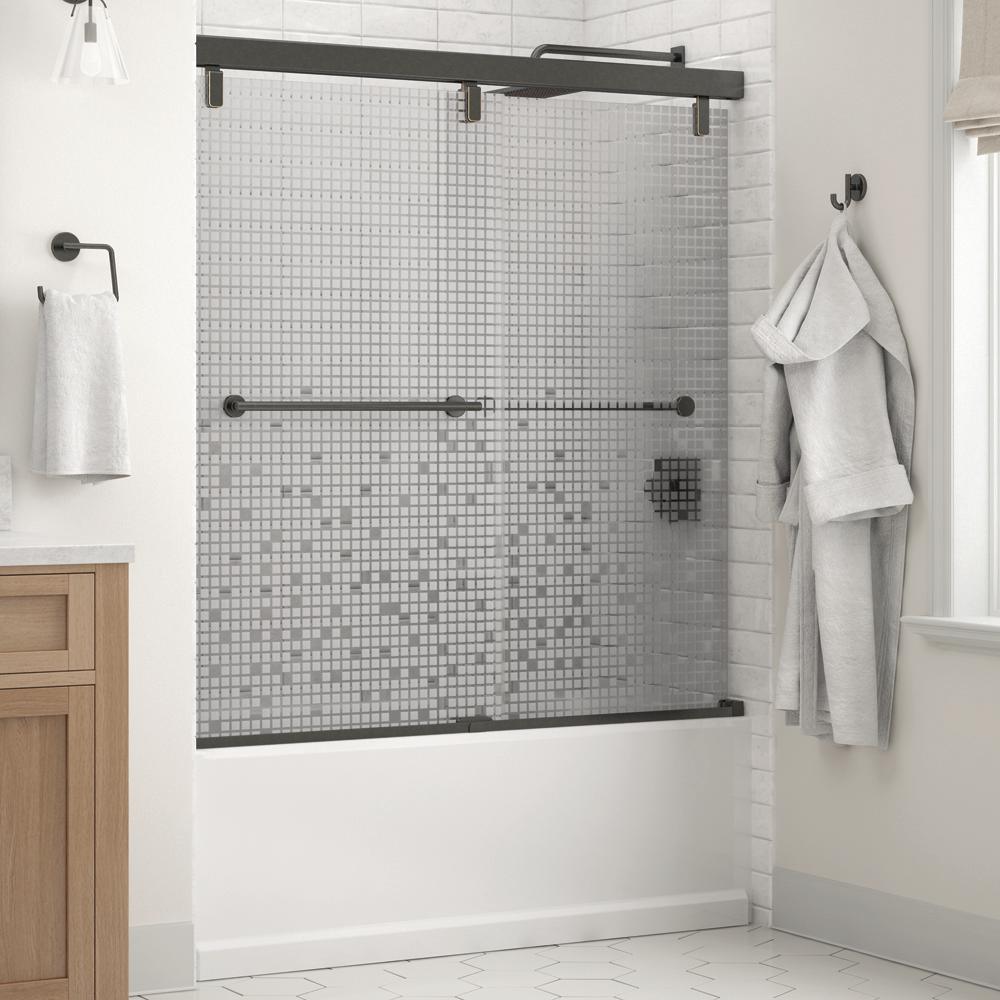 Whether you’re looking for a moderate DIY project or working on a bathroom remodel, upgrading your bathroom with a new sliding shower door is easy with the Delta 1-2-3 custom sliding shower door program. Delta’s custom glass shower door program offers 1000s of design combinations by choosing your glass shower panels, shower door track, and shower door handles to build a unique, personalized glass shower door. Clean, sleek and modern, the Mod bathtub door track in nickel features a soft close system paired with a reversible flat track, and minimal metal components, for the perfect balance of form and function. Make a statement with standard 1/4 in. ANSI certified tempered glass shower panels, featuring a textured surface that resembles water running down the panels for a spa-like feel and the most privacy. The Lyndall sliding shower door handles in nickel feature two convenient towel bars for extra bathroom storage in a contemporary design silhouette that beautifully demonstrates simplistic, modern elegance.