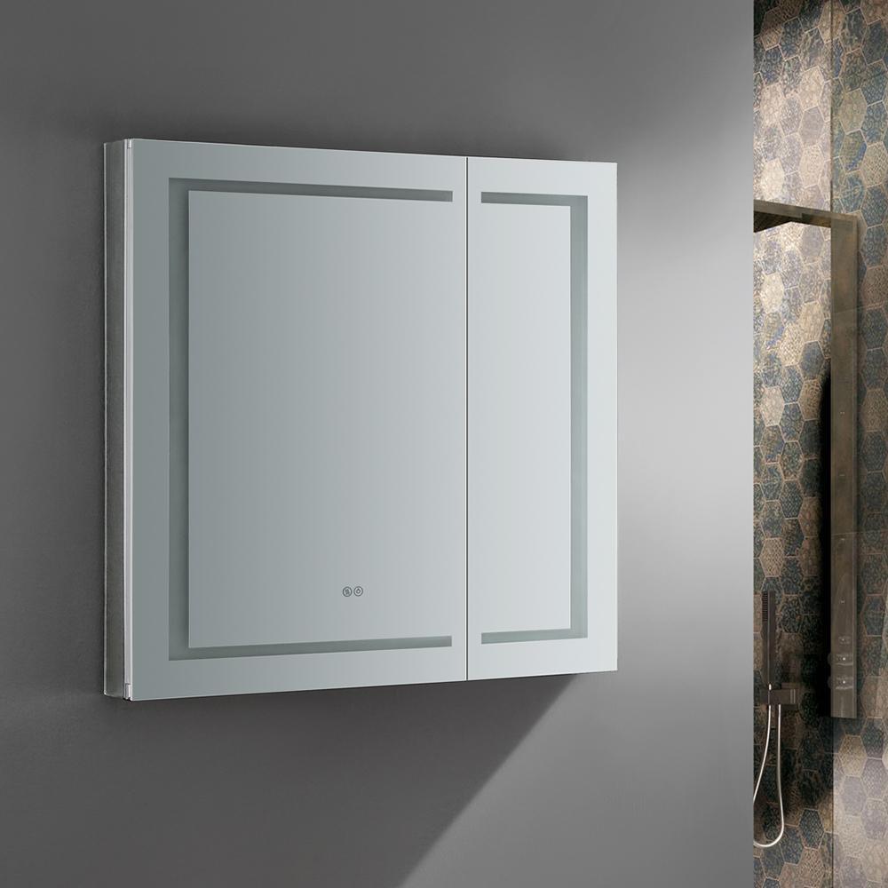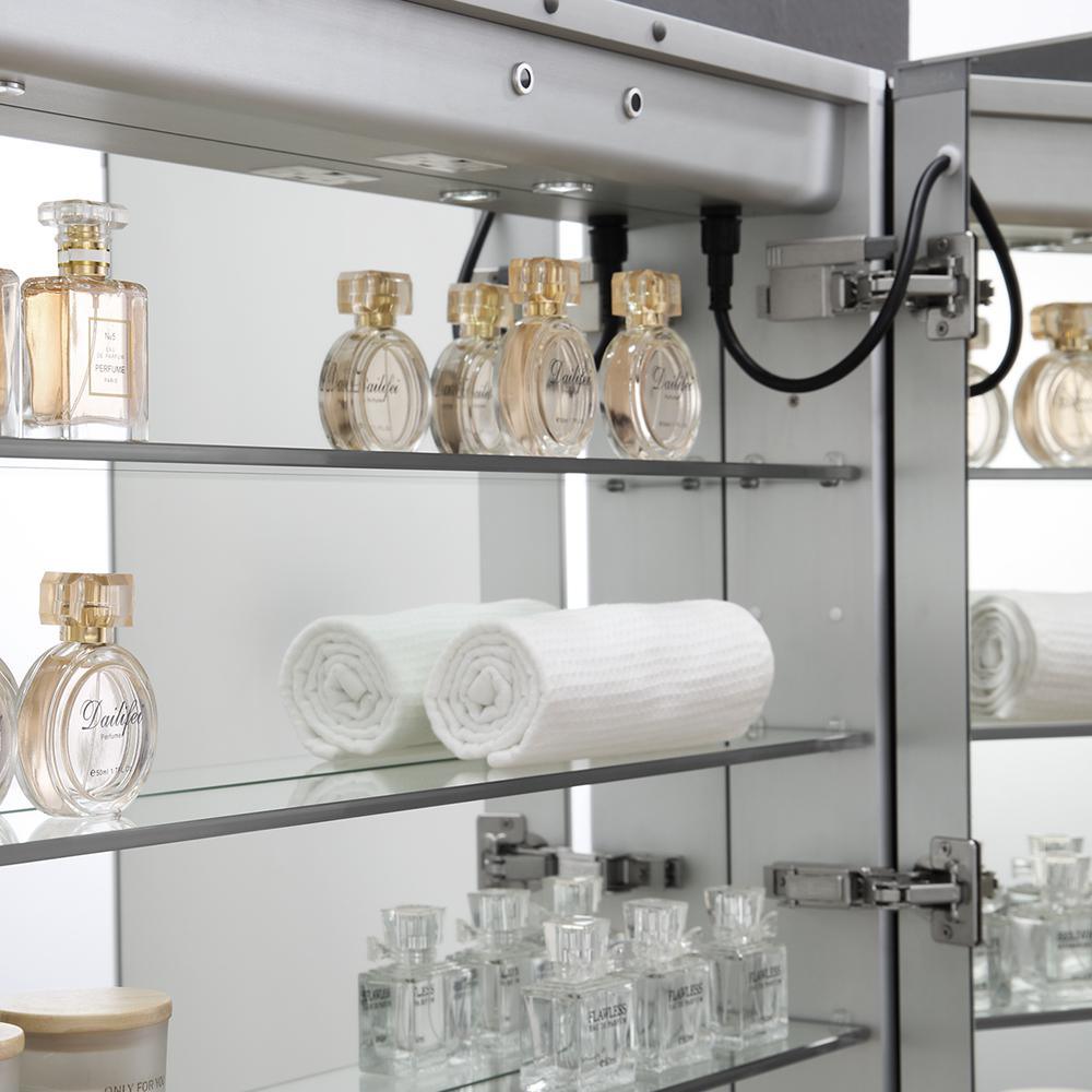 The Fresca Bathroom Medicine Cabinet comes with everything you need to create an elegant and modern bathroom, with every convenience right in front of you. On the outside, its a sophisticated mirrored medicine cabinet with a built-in dimmable surface LED task light which creates an illuminated frame within the mirror. It also has a defogger feature. Inside, there's an LED light and a handy electrical/USB outlet combo for an electric shaver, toothbrush or other essentials. The interior features 4 adjustable glass shelves and a mirrored back wall. The double-sided mirrored doors swing 170°s on soft-close BLUM hinges. Measuring 36 in. W x 36 in. H x 5 in. D, this medicine cabinet is available in several sizes.