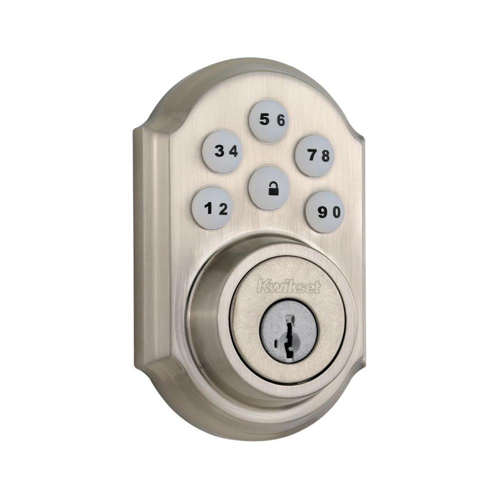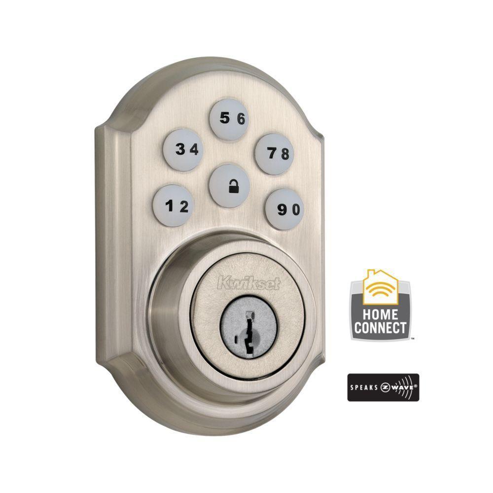 The SmartCode touchpad smart lock with Home Connect technology enables the lock to wirelessly communicate with other devices in home. The lock allows the user (through a web enabled device) to remotely check the door lock status, lock or unlock the door and receive notifications. SmartCode is a one-touch locking motorized deadbolt. With your personalized code, you can enter your home with the convenience of keyless entry and the back-lit keypad provides increased visibility. SmartCode is easy to install, program and use, and operates on 4 AA batteries. It also features SmartKey Security as the back-up keyway. This single cylinder deadbolt can be locked or unlocked by using the keypad or key from the outside as well as the turn button from the inside. The crisp, clean appearance of the Satin Nickel finish adds to the overall look of the product and brings a modern feel.