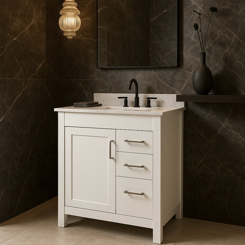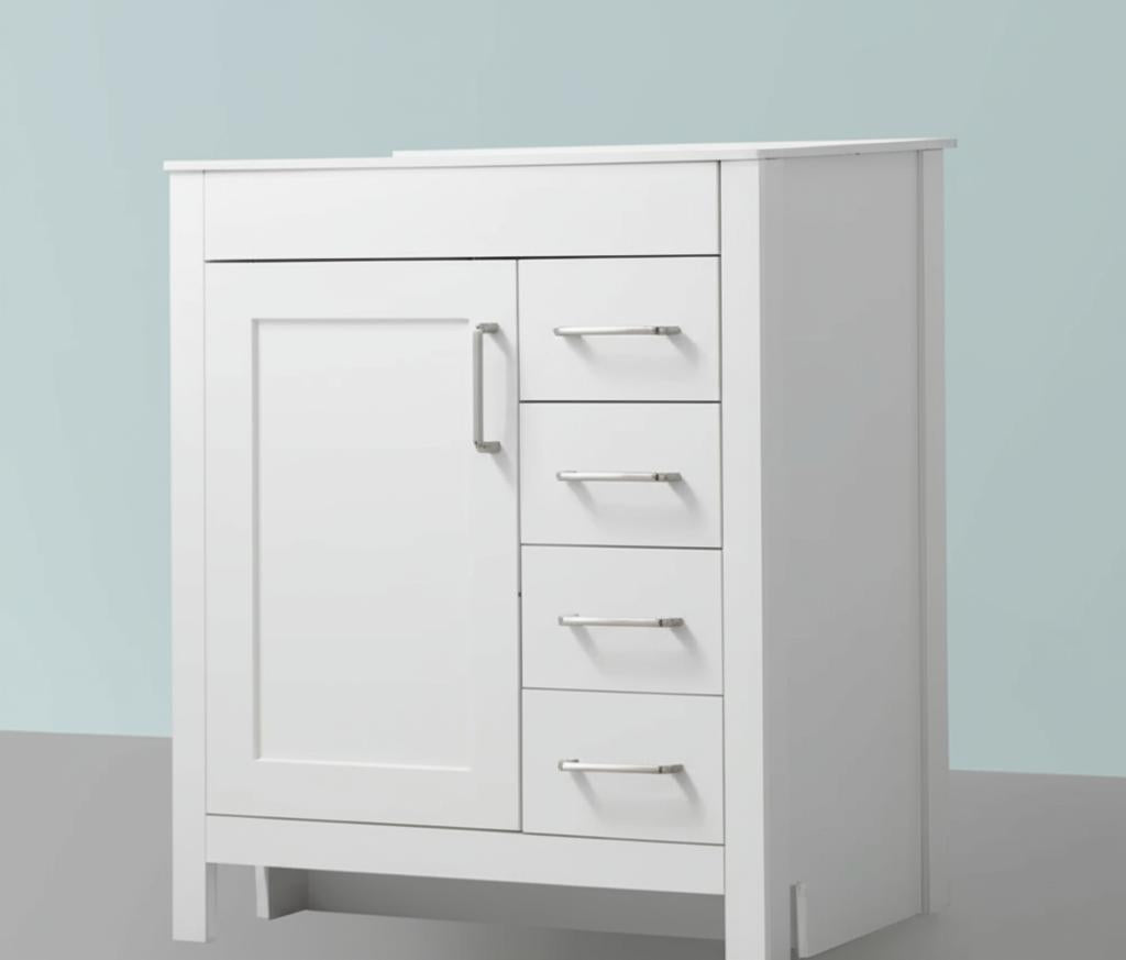The Westcourt 30-inch Bathroom Vanity Cabinet in White combines modern design with practical storage solutions. Featuring a shaker-style door, four full-extension drawers, and soft-close hinges, this cabinet is both stylish and functional.